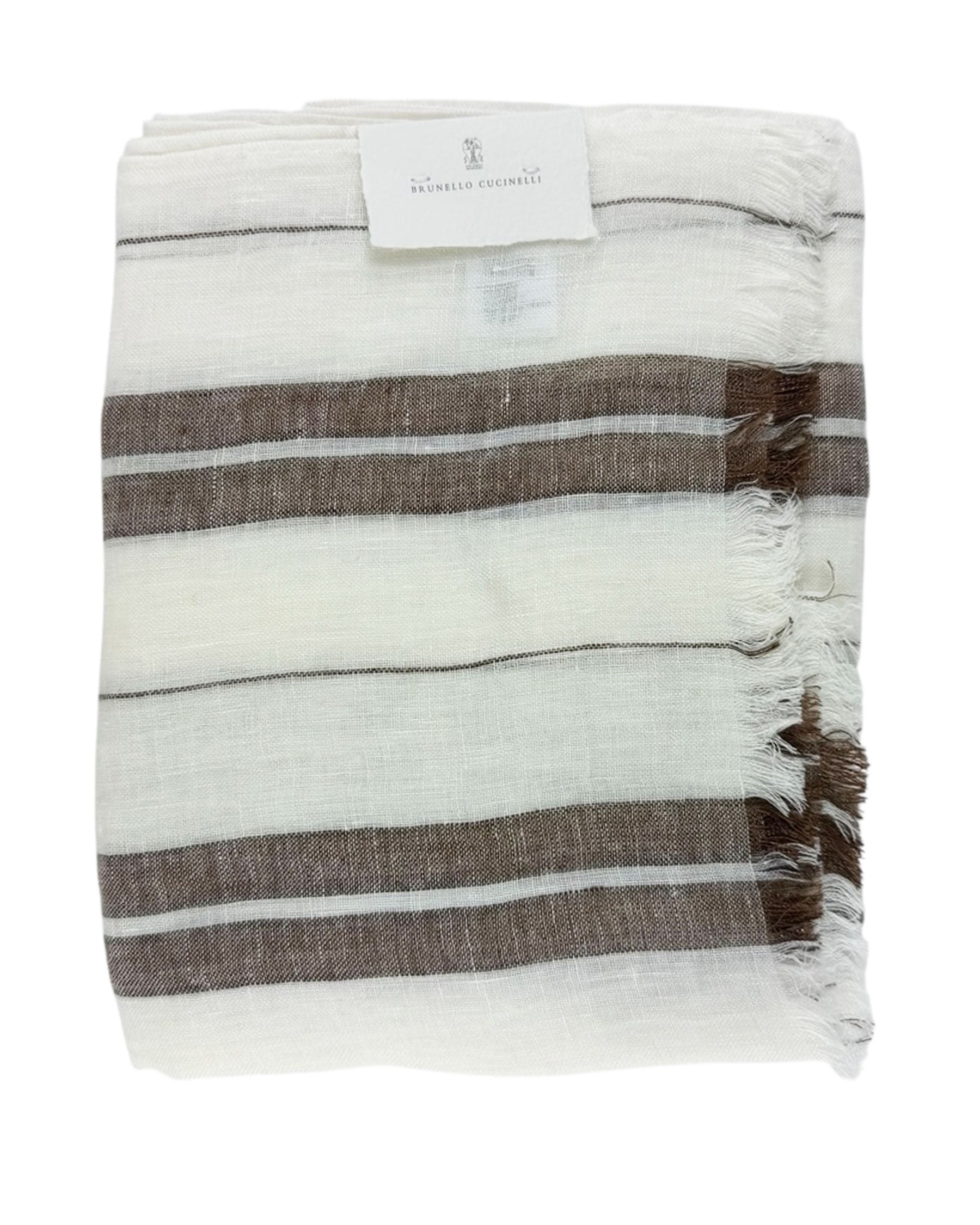 Unisex: Authentic Brunello Cucinelli scarf, white brown striped design, linen blend, short eyelash fringe, made in Italy. Genuine discounted Brunello Cucinelli men suits, scarves, ties, dress shirts, the very best fabrics and quality.