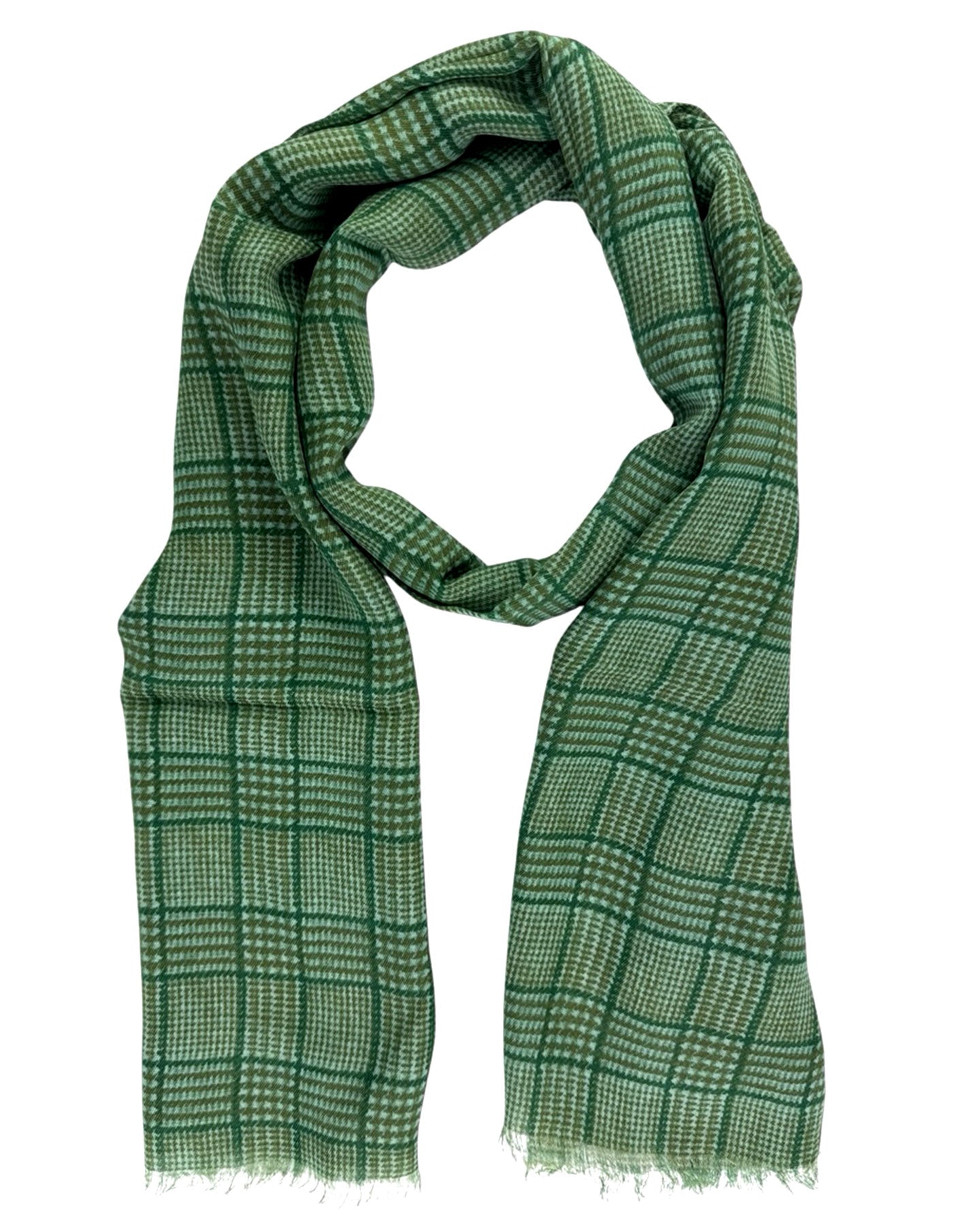 Genuine Attolini scarf, shades of green plaid check, short eyelash fringe, fancy lightweight cotton cashmere, made in Italy. Cesare Attolini: sartorial quality men designer shawls and scarves, men collection at outlet prices. Shop discount Attolini scarves.