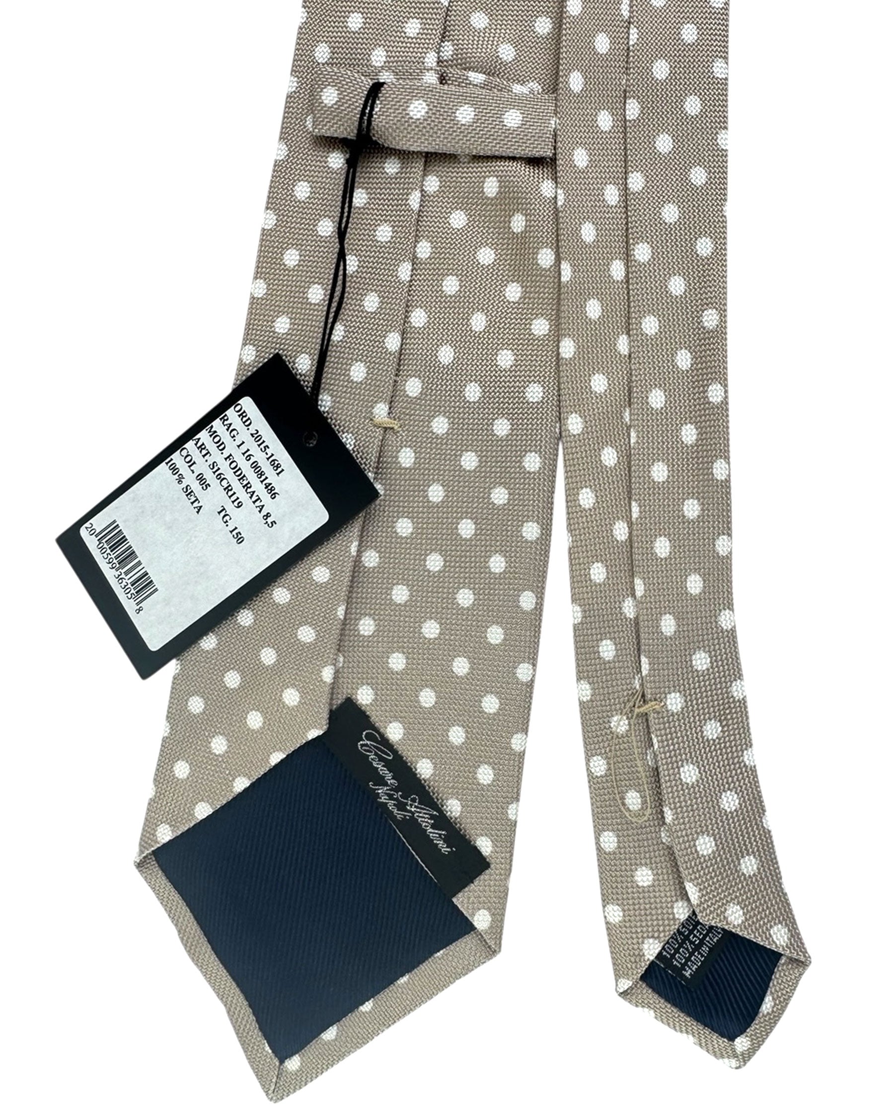 Authentic Cesare Attolini tie, taupe polka dots design, silk, hand made in Italy. Cesare Attolini is a luxury sartorial brand from Napoli, Italy. Cesare Attolini has been synonymous with sartorial craftsmanship since the 1930s.