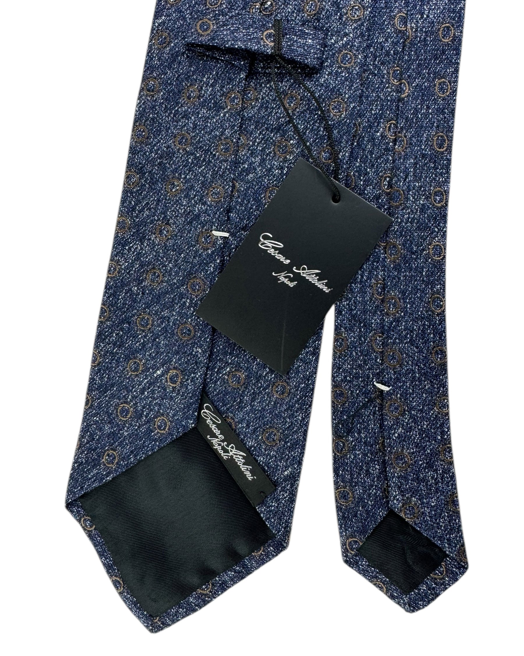 Fall/ Winter Collection: Genuine Cesare Attolini Napoli tie, (slightly) wide 3.6"/9cm width, midnight blue patterned - taupe circles, jacquard silk, hand made in Italy. Cesare Attolini is a sartorial / bespoke brand from Napoli, Italy. Cesare Attolini has been synonymous with sartorial craftsmanship since the 1930s.