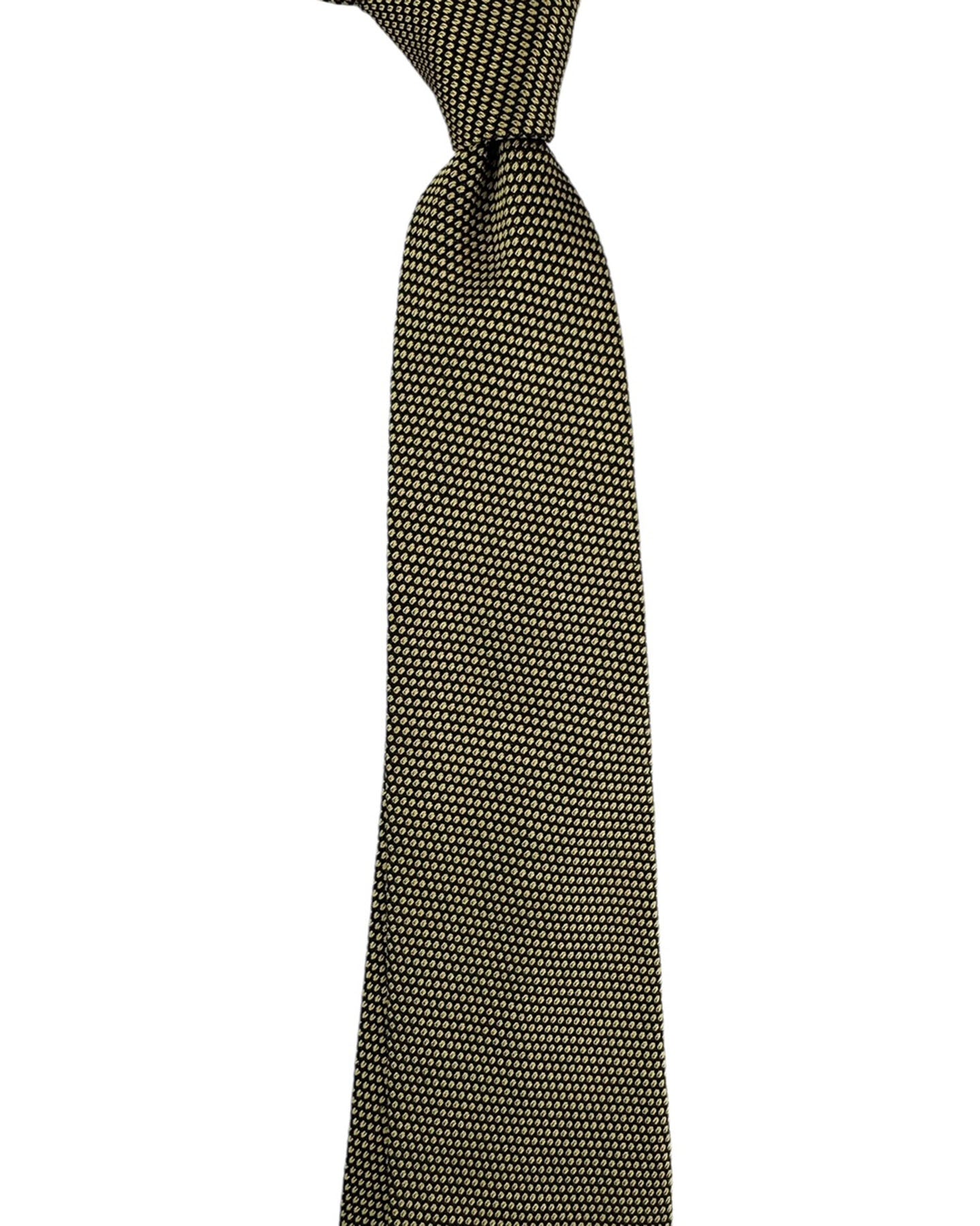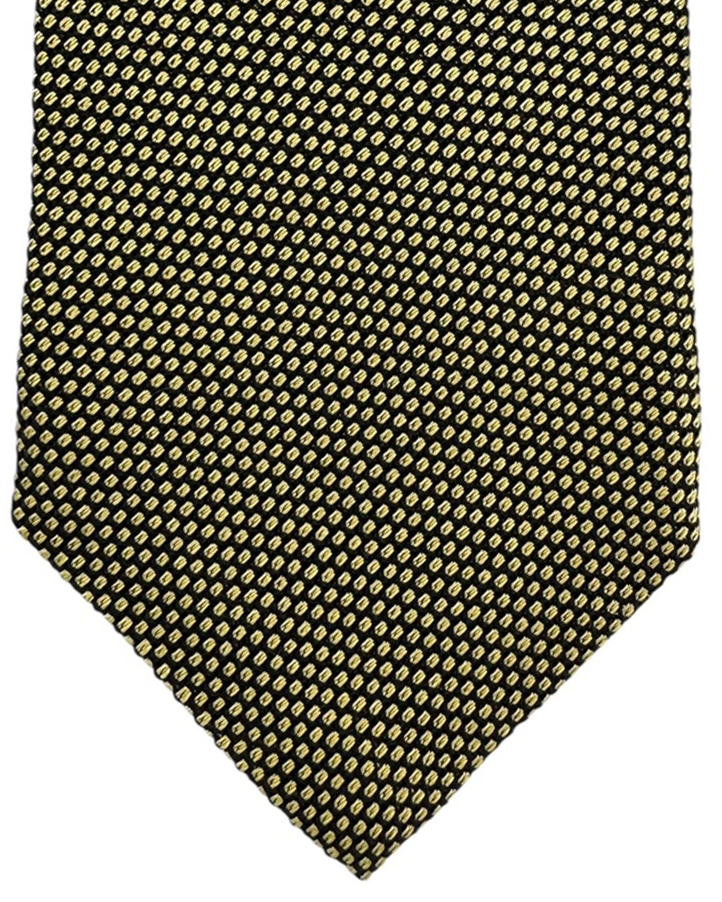 Genuine Cesare Attolini Napoli unlined tie, black silk tie featuring repeating yellow dots in a subtle textured weave, jacquard silk, hand made in Italy. Cesare Attolini is a sartorial / bespoke brand from Napoli, Italy.