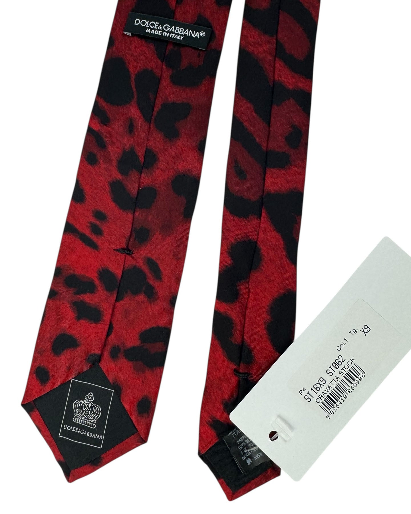 Genuine Dolce & Gabbana skinny tie, dark red tie with bold black leopard spots, silk, hand made in Italy. Authentic Dolce & Gabbana men collection fashion accessories, made in Italy. Discount luxury brand name ties.