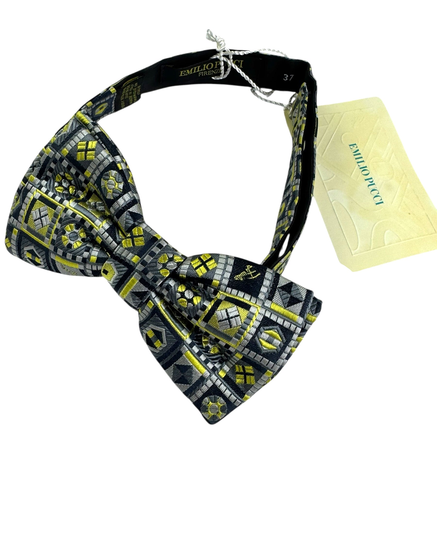 Luxury bow ties: Genuine Emilio Pucci pre-tied bow tie, gray black design with bright lime-olive geometric detail, luxury printed silk, hand made in Italy. Fancy silk bow ties by Pucci, shop silk bow ties at outlet prices: designer bow ties | pre tied bow ties.