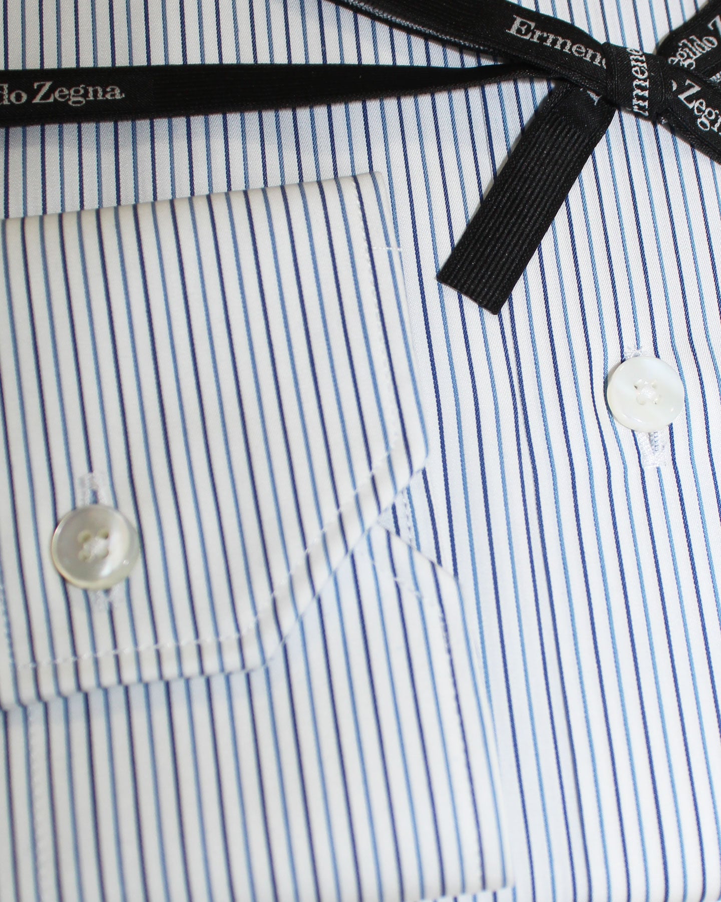 Genuine Ermenegildo Zegna dress shirt, regular fit, white navy blue stripes design, cotton fabrics, spread collar. Luxury men dress shirts. Authentic Ermenegildo Zegna shirts, ties and accessories at outlet prices.