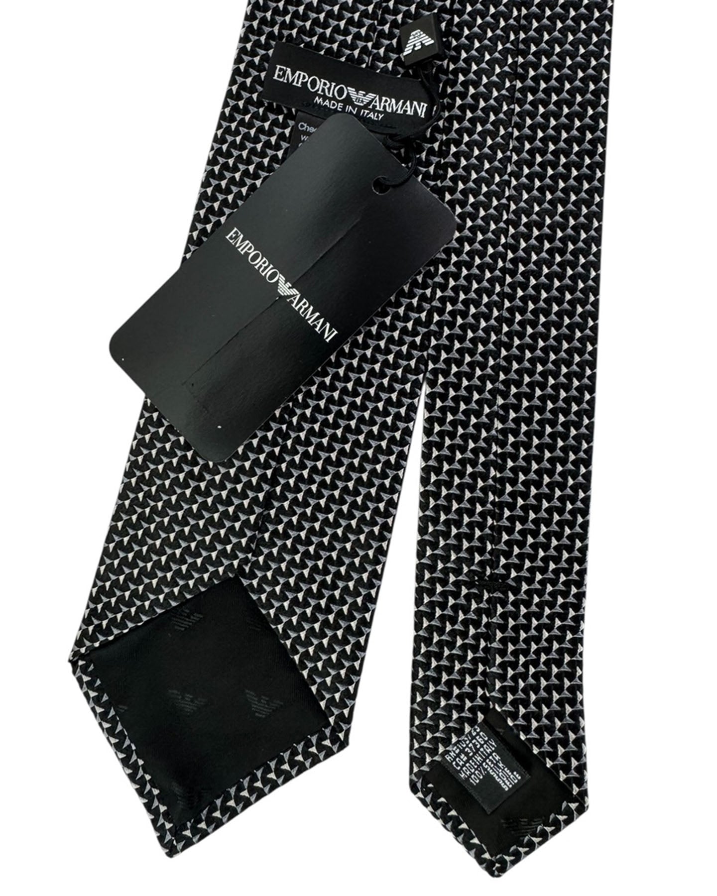 Genuine Emporio Armani tie, features a repeating geometric triangle motif, silk, hand made in Italy. Luxury Armani men collection online. Discount men designer ties.