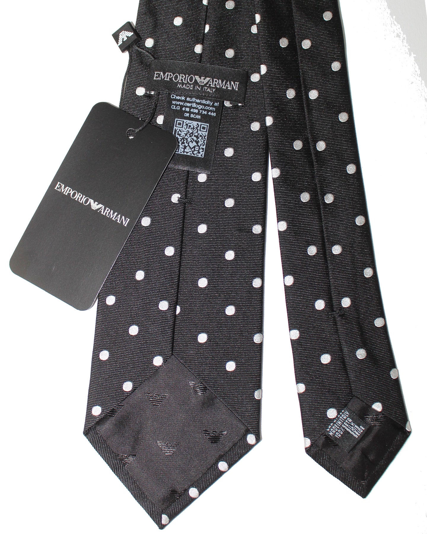 Genuine Emporio Armani tie, silk, black silver polka dots design, hand made in Italy. Luxury Armani silk ties, men collection online. Discount men designer ties.