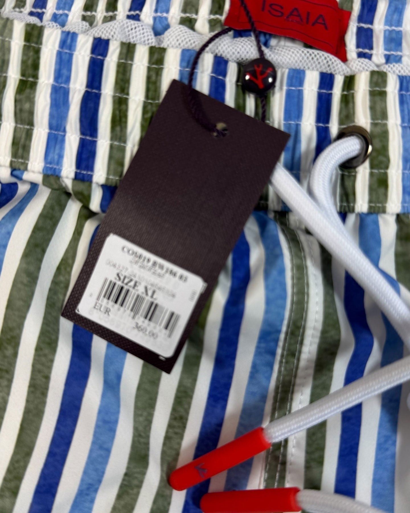 Men luxury swimwear: Authentic Isaia swim shorts, striped design, strings with Isaia coral logo, luxury swim trunk, back pocket with Isaia coral logo, hand made in Italy. Authentic Isaia Napoli. View all Isaia men accessories | luxury swimwear.