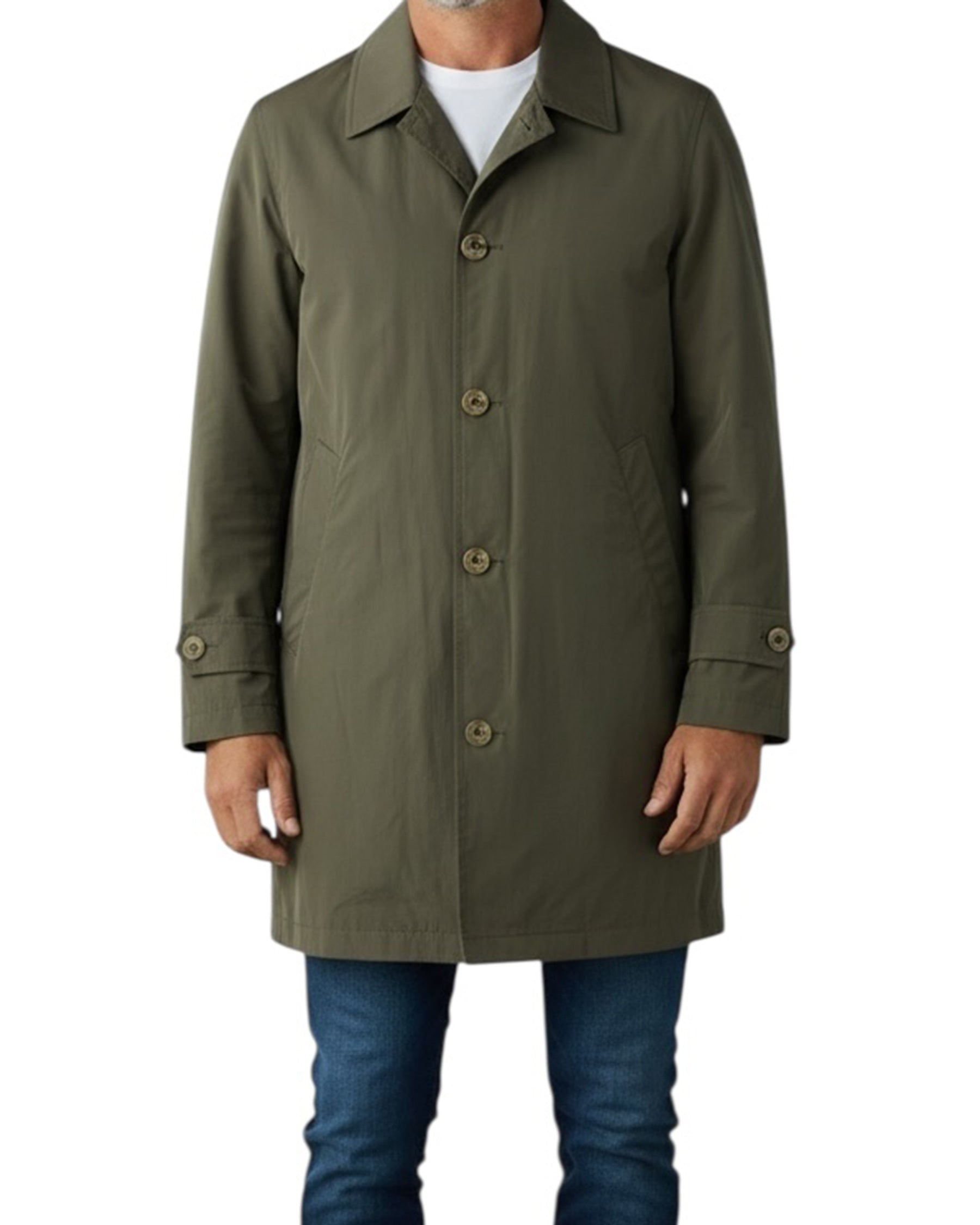 Sartorial: Genuine Luigi Borrelli rain coat, forest green, 2 way zip and button front closure, two front pocket and zip interior pocket, collar, button cuffs, lightweight poly, amazing tailoring, hand made in Italy. Sartorial quality men sport jackets and suits by Luigi Borrelli. Shop Bespoke Sport Coats.