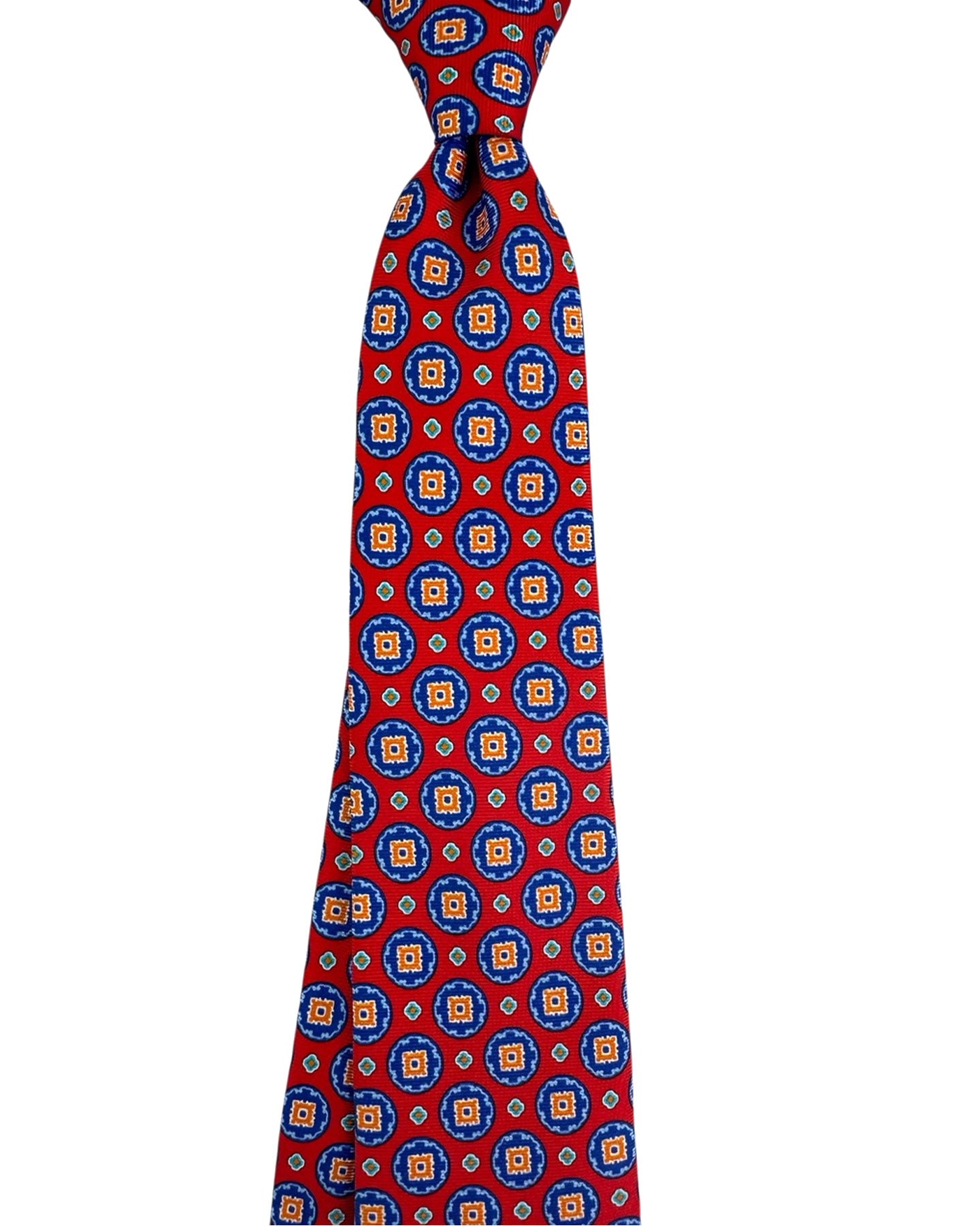 Authentic Kiton tie, red royal blue medallion, sevenfold construction, silk, self tipped, hand made in Italy. Genuine Kiton ties, luxury men accessories, dress shirts and suits: sartorial quality.