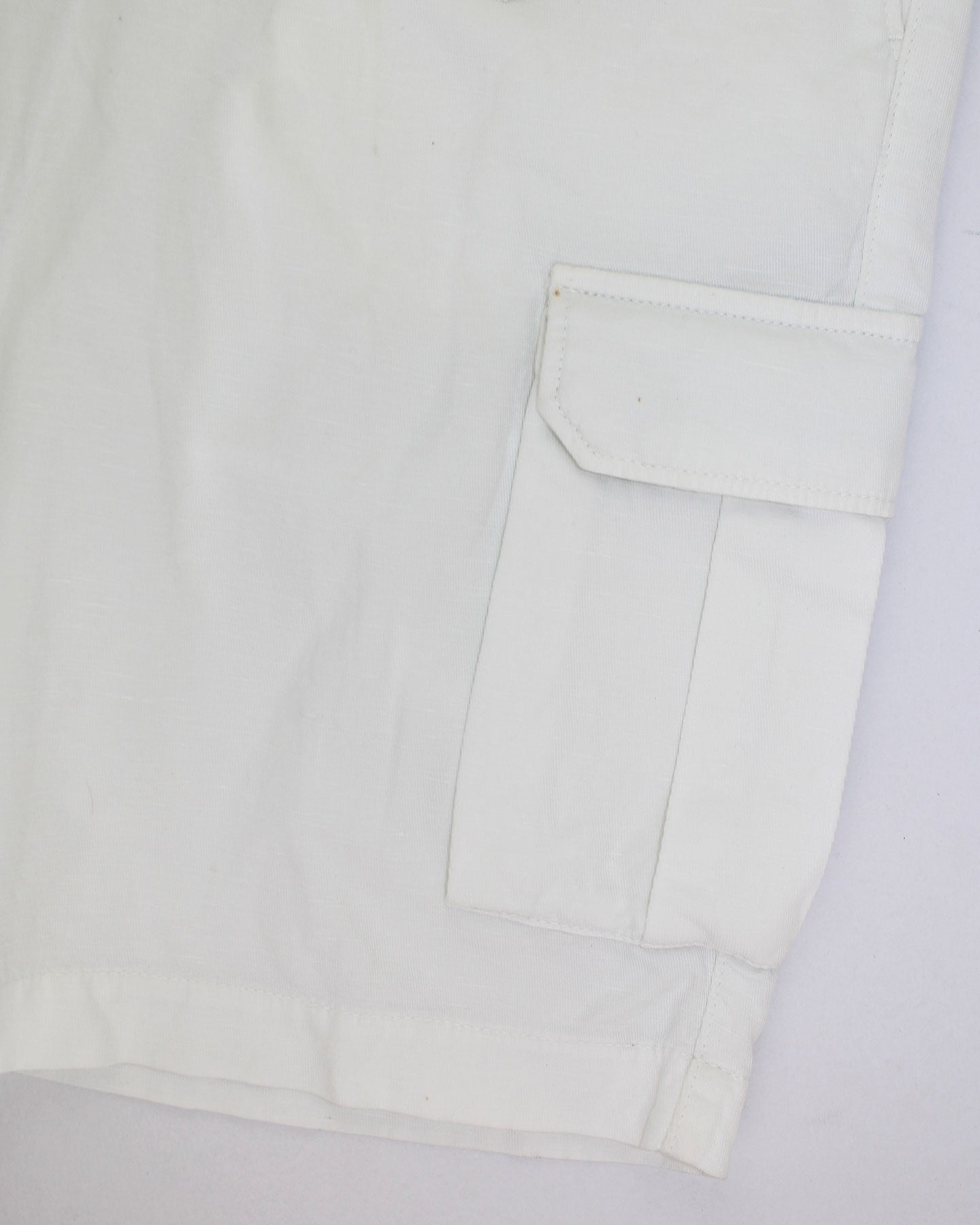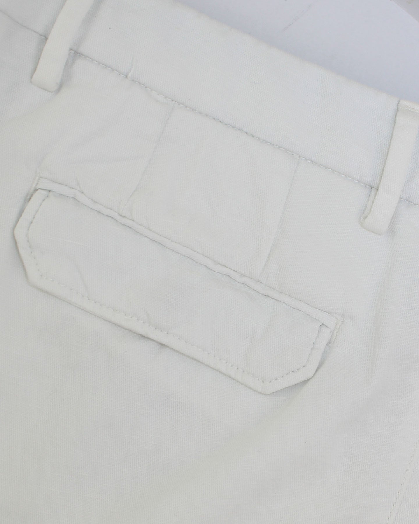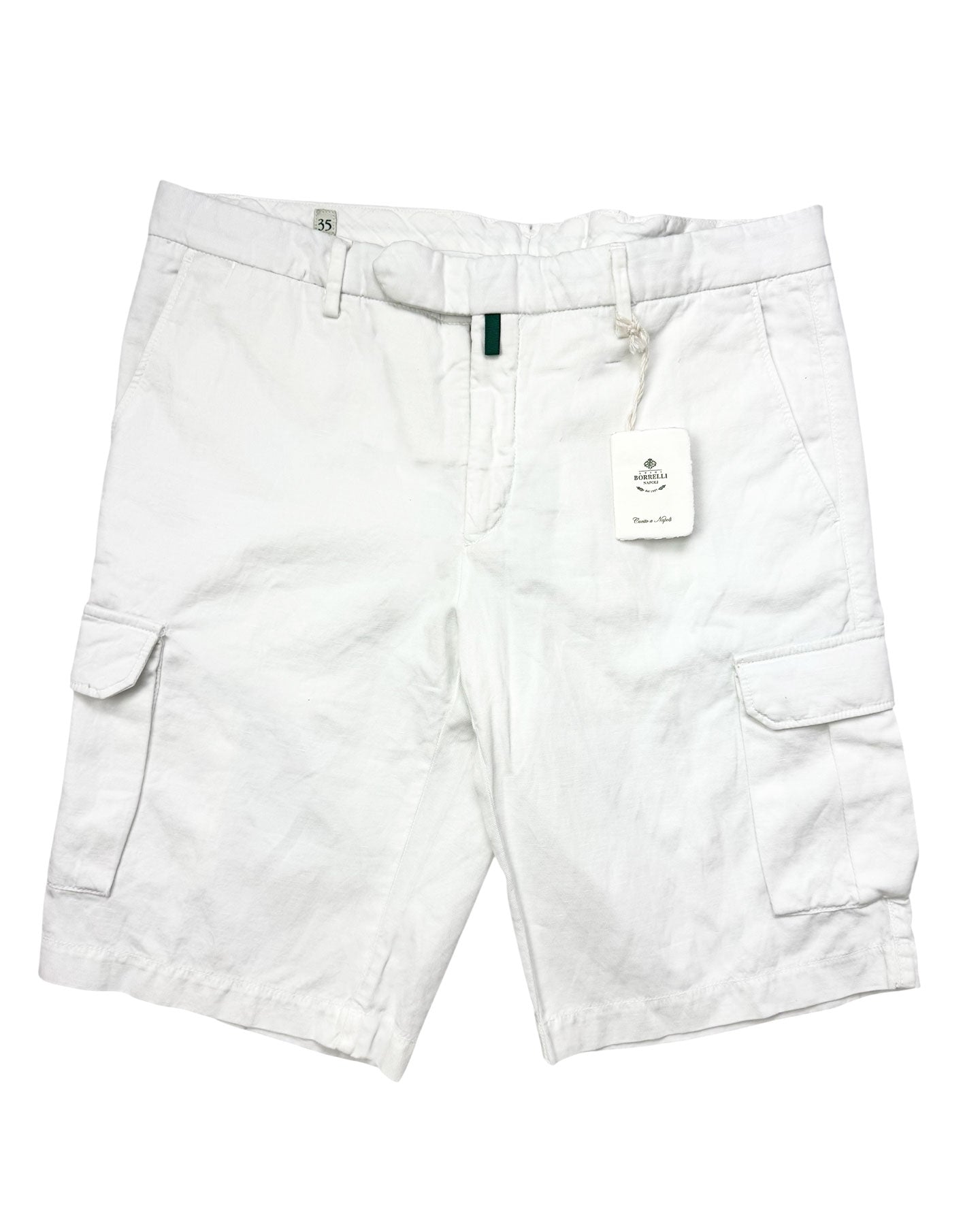 Genuine Borrelli shorts, white, linen/ cotton, zip fly, cargo pockets, slim fit, hand made in Italy. Luigi Borrelli Napoli men collection, hand made jeans. View all shorts/ jeans/ pants. Shop matching zip sweater!