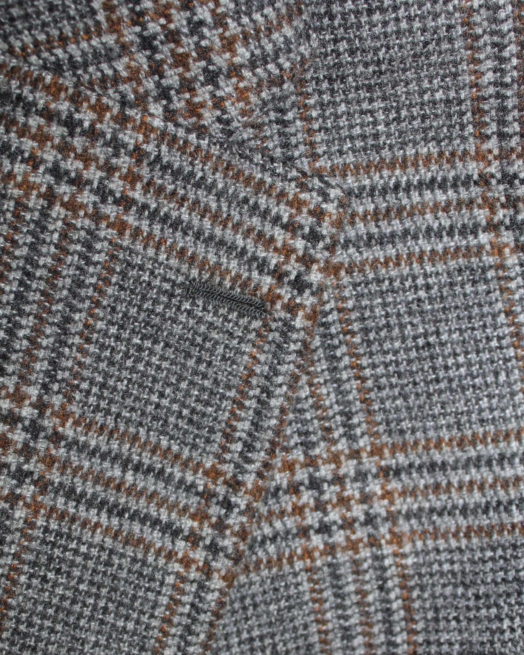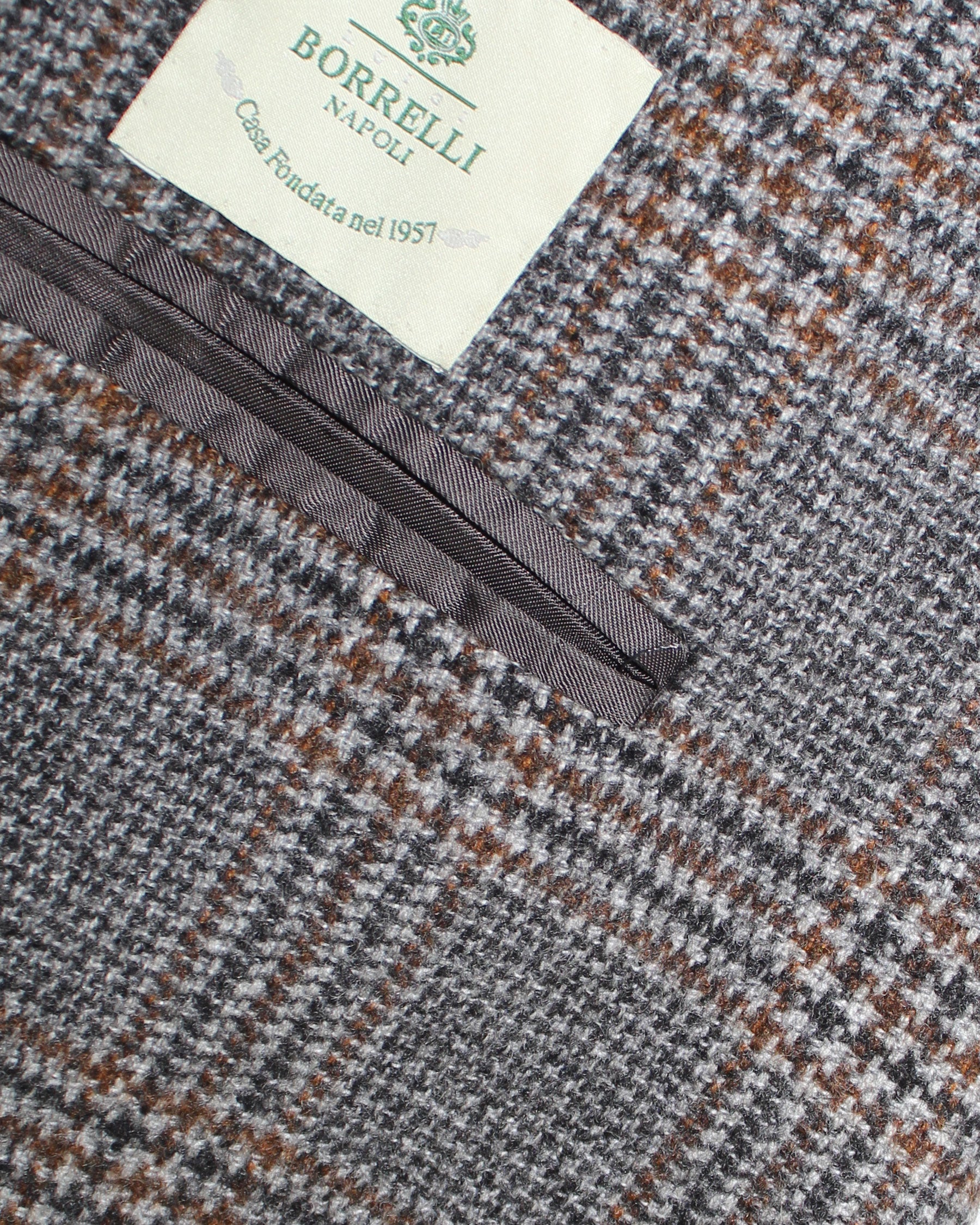 Genuine Luigi Borrelli sport coat, 3 button, notch lapel, gray brown plaid design, fancy medium weight cashmere, unlined jacket/ blazer, soft shoulders, hand made in Italy. Sartorial quality men suits by Luigi Borrelli, hand made in Italy.