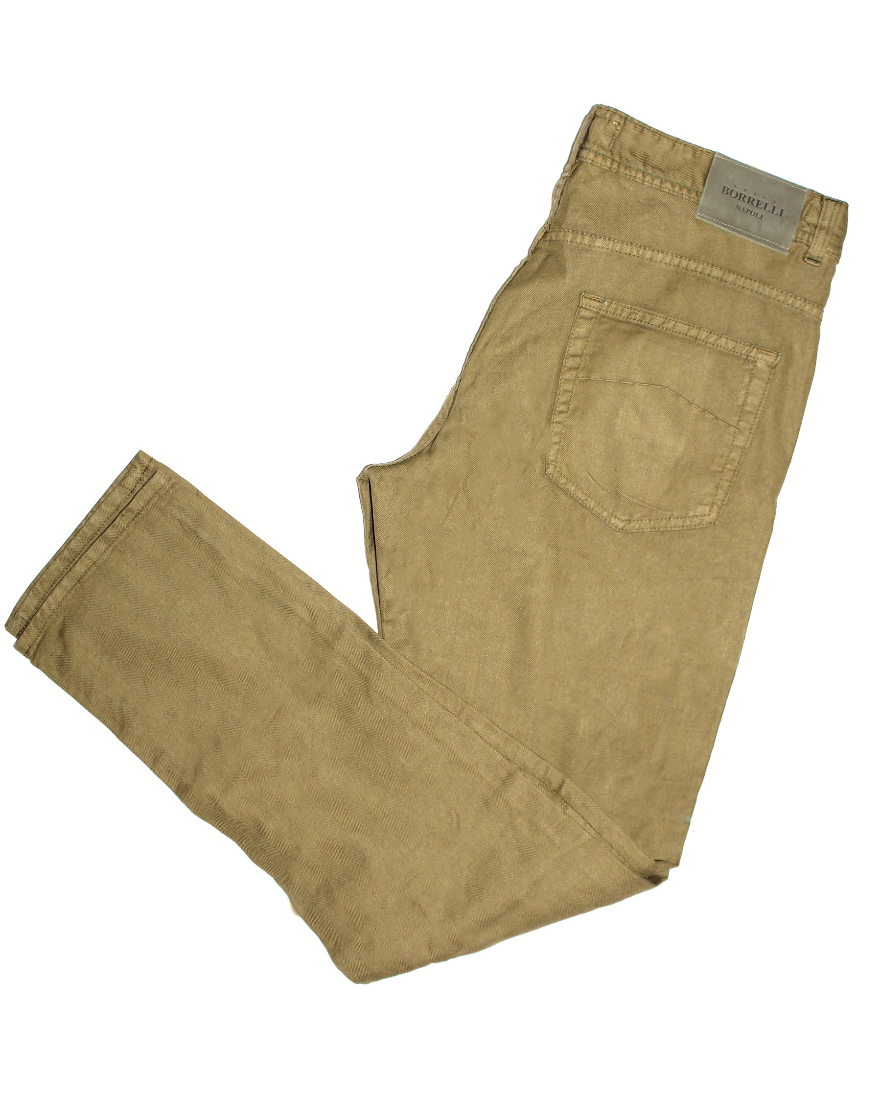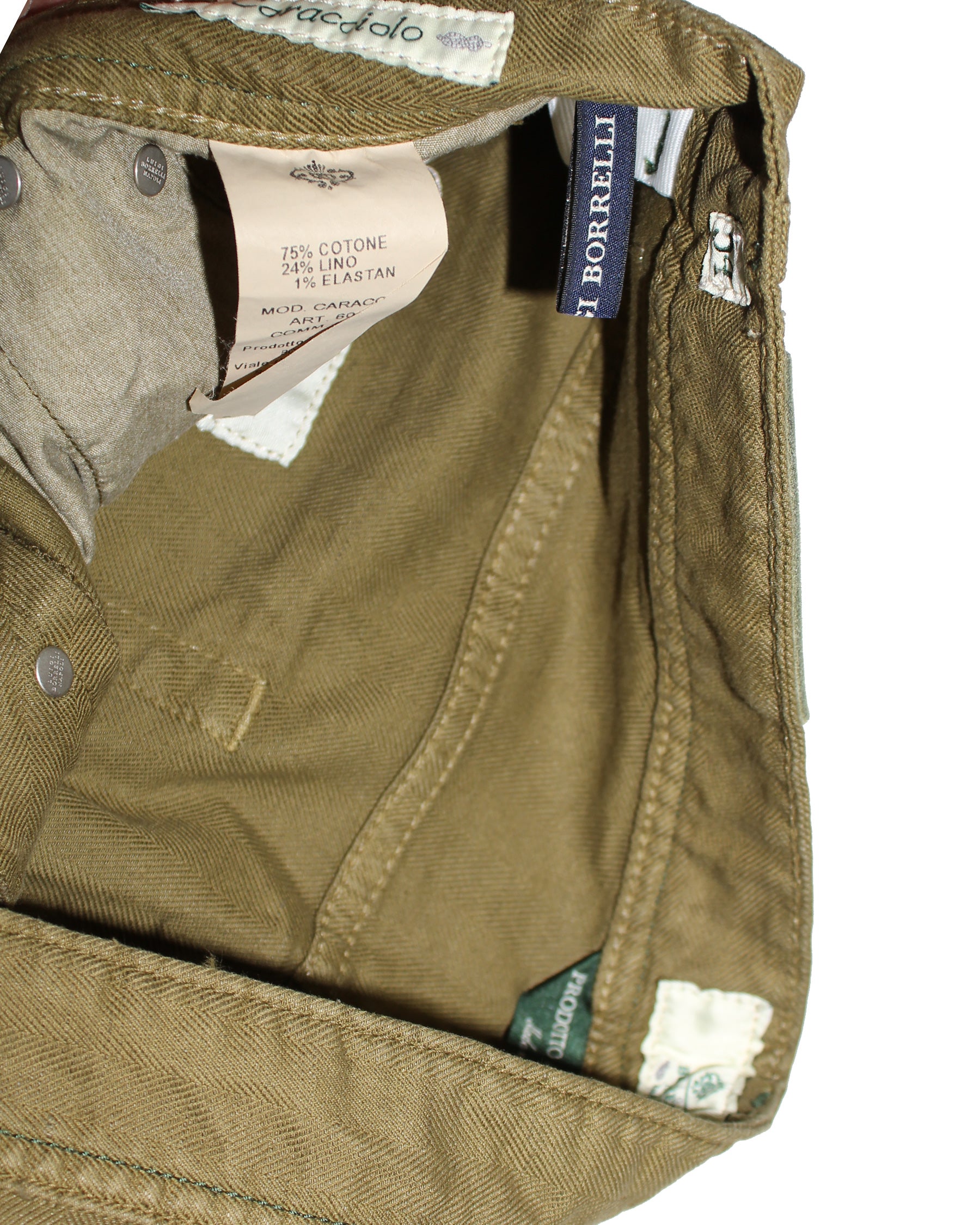 Sartorial: Genuine Borrelli jeans, olive green, slim fit pants, button fly, hand made in Italy. Luigi Borrelli Napoli men collection, hand made jeans, sartorial tailoring. View all sartorial men jeans/ pants.