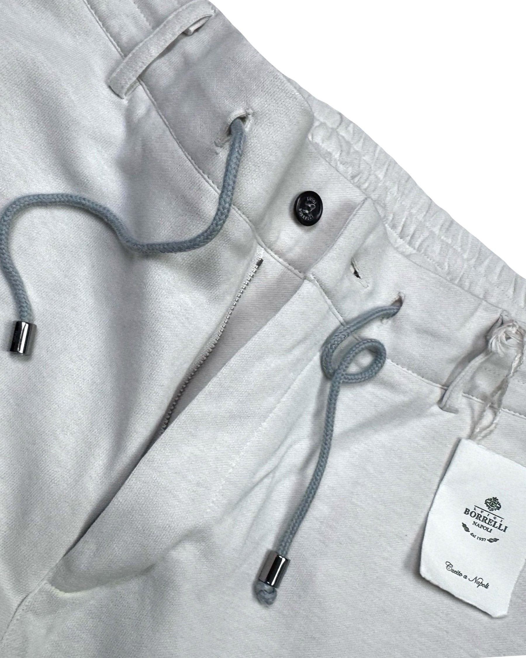 Top quality: Genuine Borrelli stylish jogger pants, slim fit, light oatmeal (white-beige), cotton, zip fly, logo drawstrings, hand made in Italy. Luigi Borrelli Napoli men collection, hand made jeans. View all men jogger pants. Shop matching zip sweater!