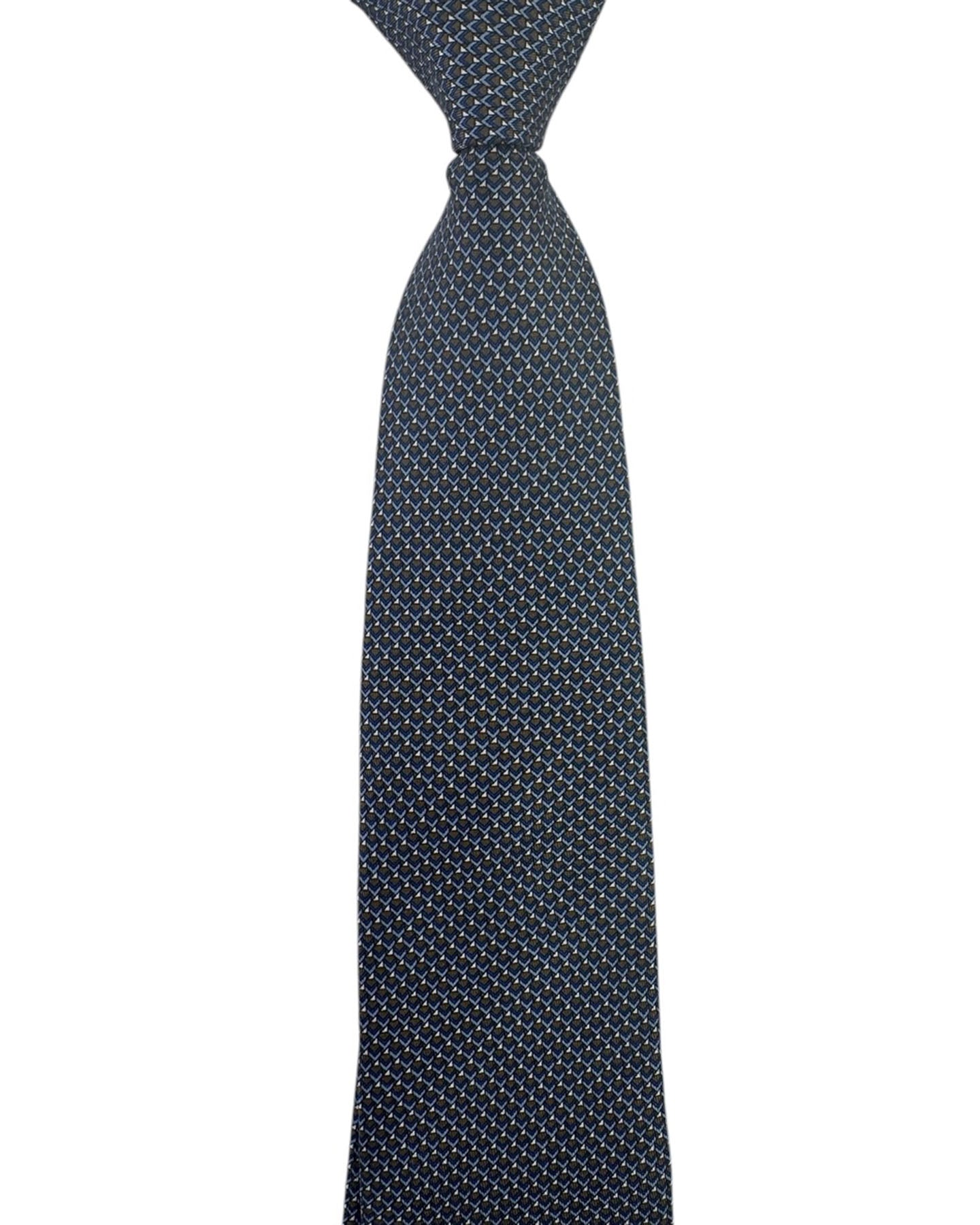 Genuine Brioni tie, midnight blue brown micro geometric, silk, hand made in Italy. Discount Brioni ties, sartorial quality accessories for men, Brioni at outlet prices.