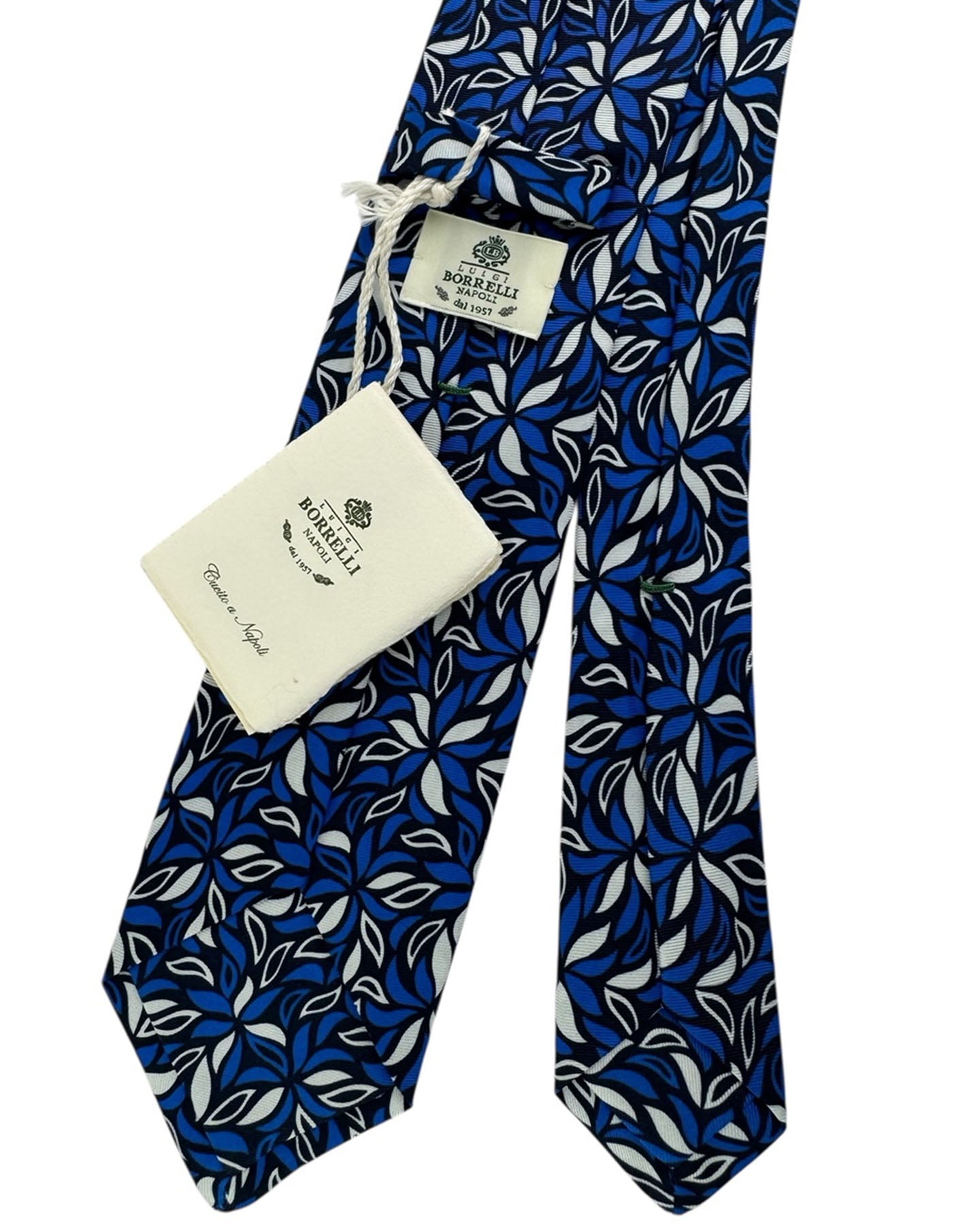 Neapolitan sartorial style: Authentic Luigi Borrelli tie, bold navy tie with swirling leaf-like motifs in shades of cobalt blue and white, arranged in a floral burst pattern, self tipped, hand made in Italy. Genuine Luigi Borrelli men collection online. Sartorial quality Italian ties at discounted prices.