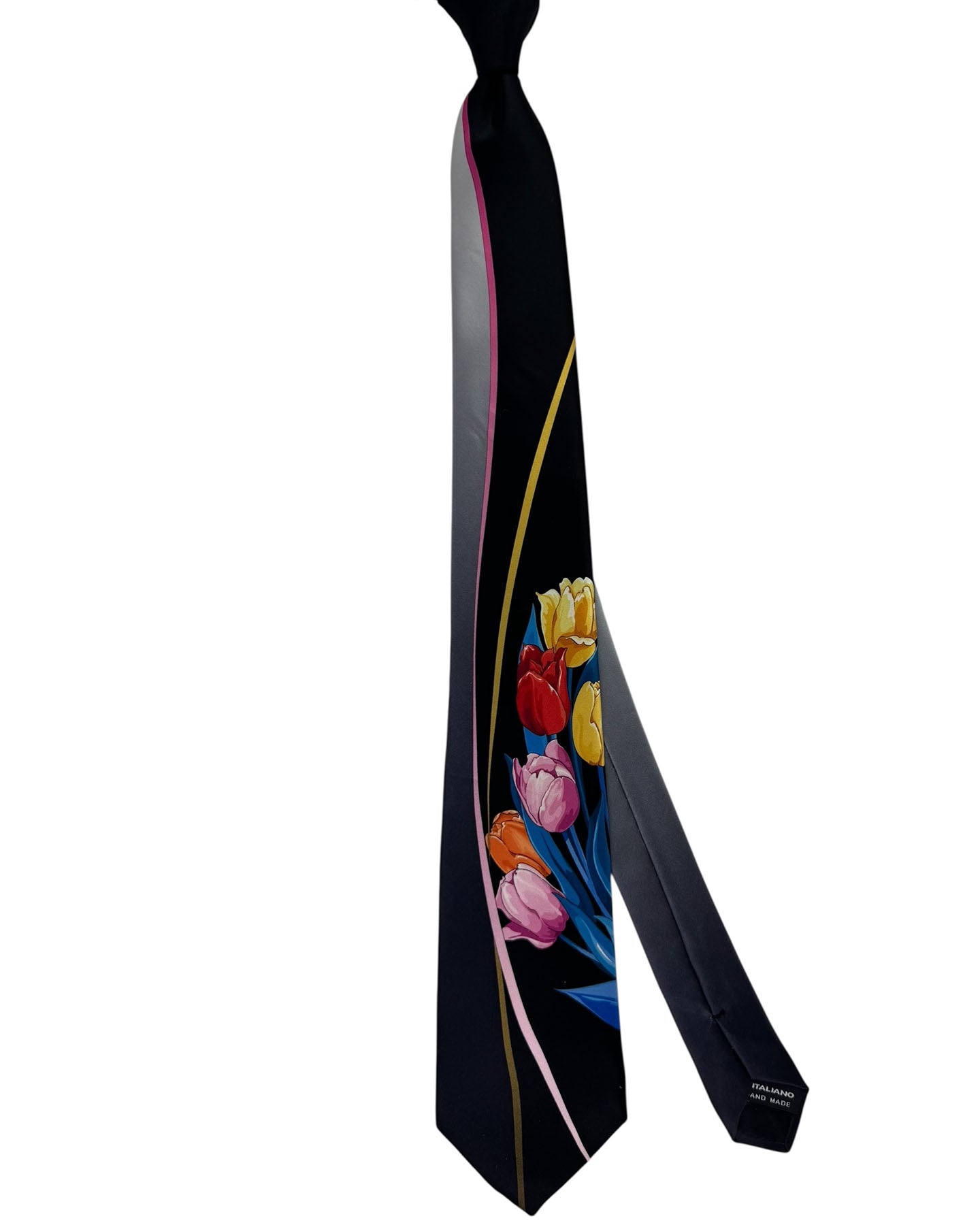Authentic Vitaliano Pancaldi tie, multicolor tulips in rich shades of red, pink, yellow, and orange pop against a black background, hand made in Italy. Genuine Vitaliano Pancaldi ties are luxury Italian designer neckties. Shop all Vitaliano ties.