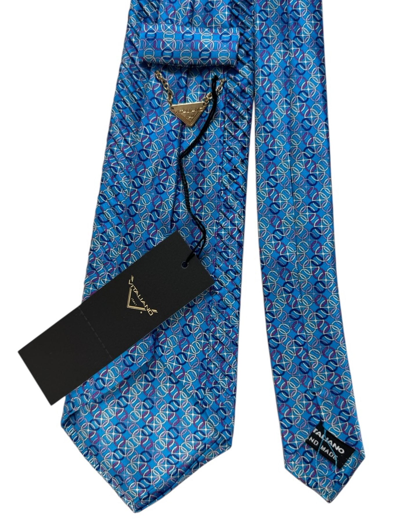 Genuine Vitaliano tie, electric blue silk tie with circular chain designs in white-silver and fuchsia, pleated silk tie, hand made in Italy. The Vitaliano Pancaldi tie is a very unique tie, made in very limited quantities, the tie features a golden chain logo hanger at the back loop. Shop all Vitaliano pleated ties at discount prices, luxury men designer gifts.