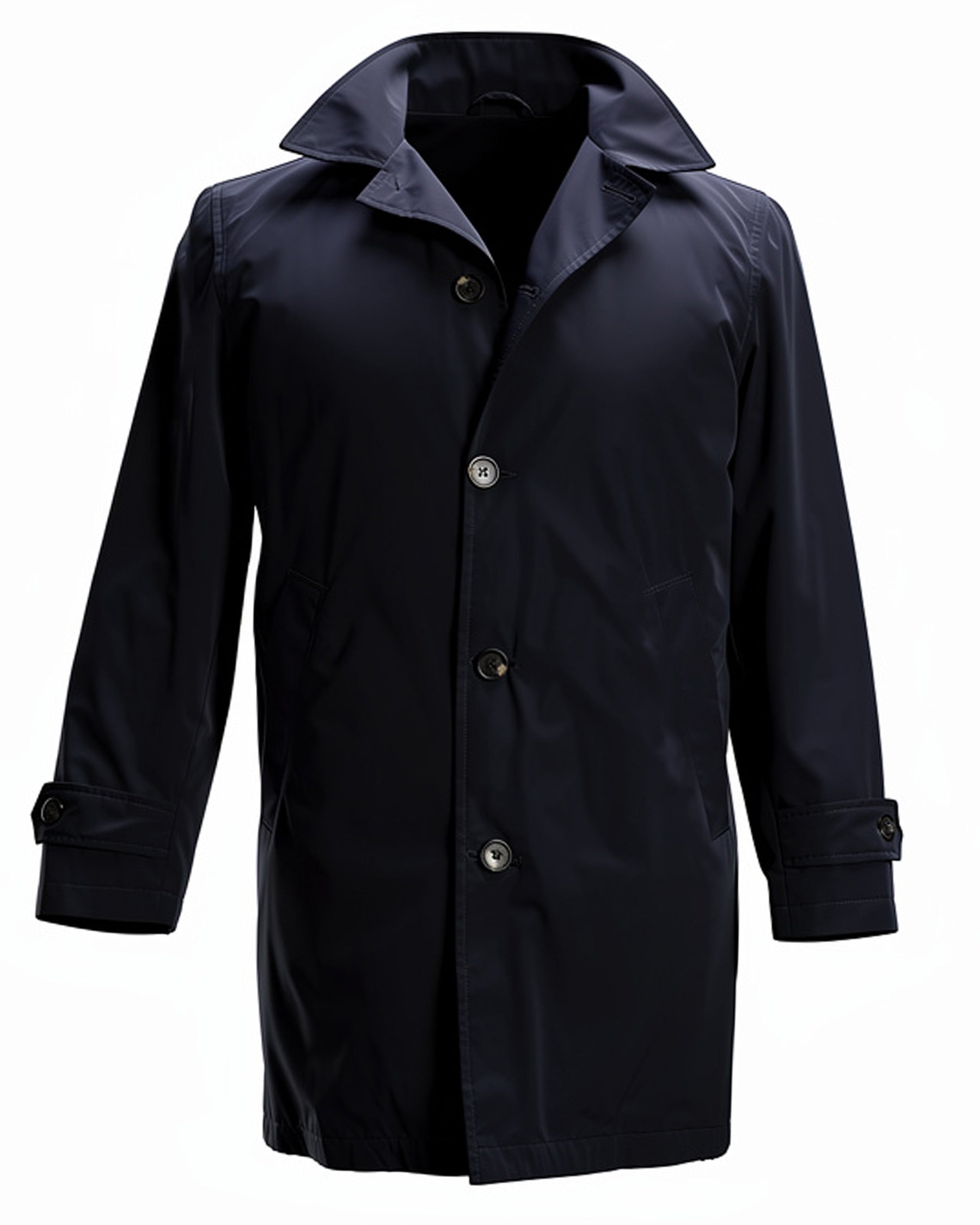 Sartorial: Genuine Luigi Borrelli rain coat, dark navy, button front closure, two front slash pockets and zip interior pocket, lightweight poly, amazing tailoring, hand made in Italy. Sartorial quality men sport jackets and suits by Luigi Borrelli. Shop Bespoke Sport Coats.