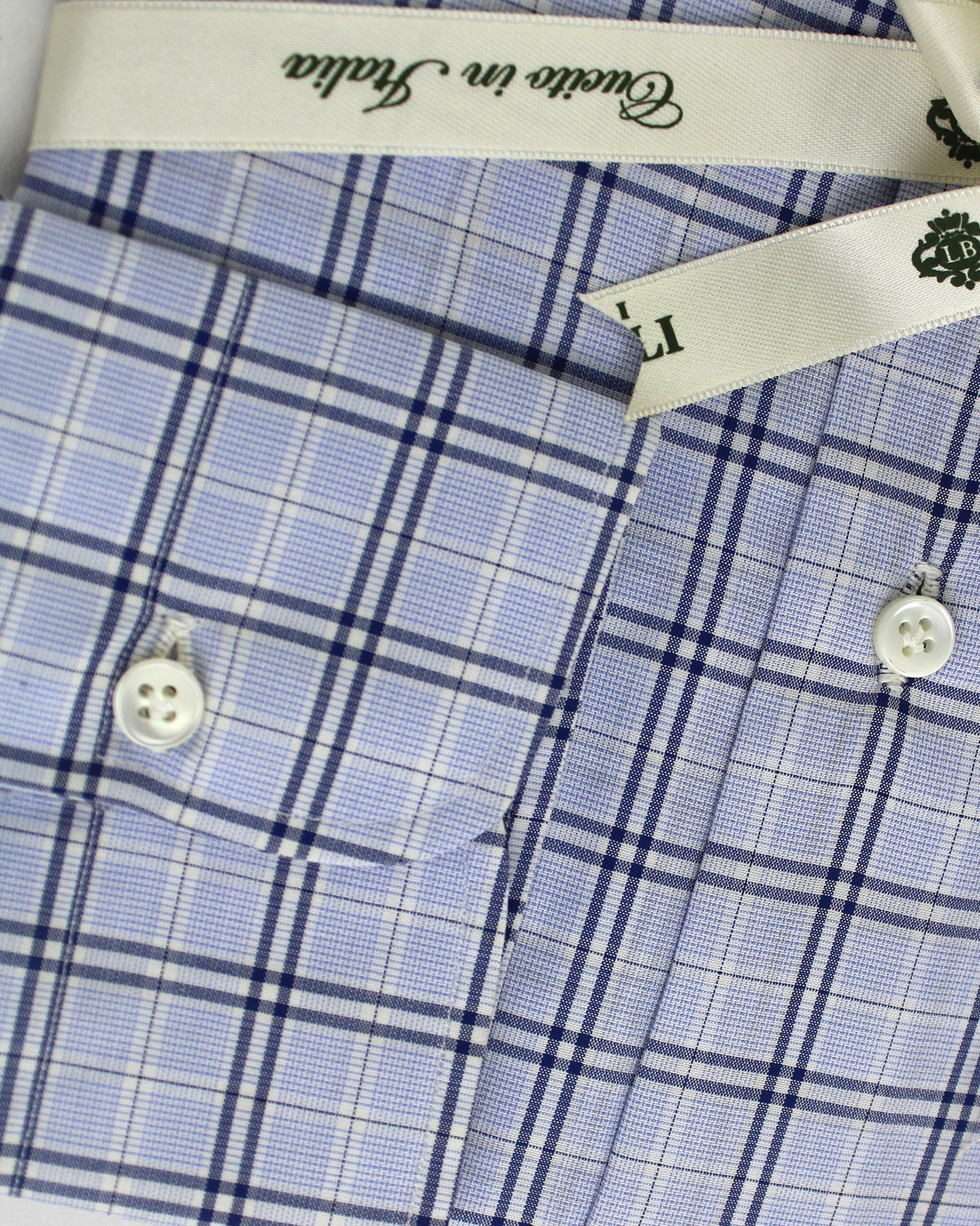 Authentic Luigi Borrelli dress shirt, modern fit, blue/ navy windowpane, spread collar, Super Sakellaridis Epyptian cotton , 8 steps by hand, made in Napoli, Italy. Shop the sartorial dress shirts and ties of the Luigi Borrelli men collection.