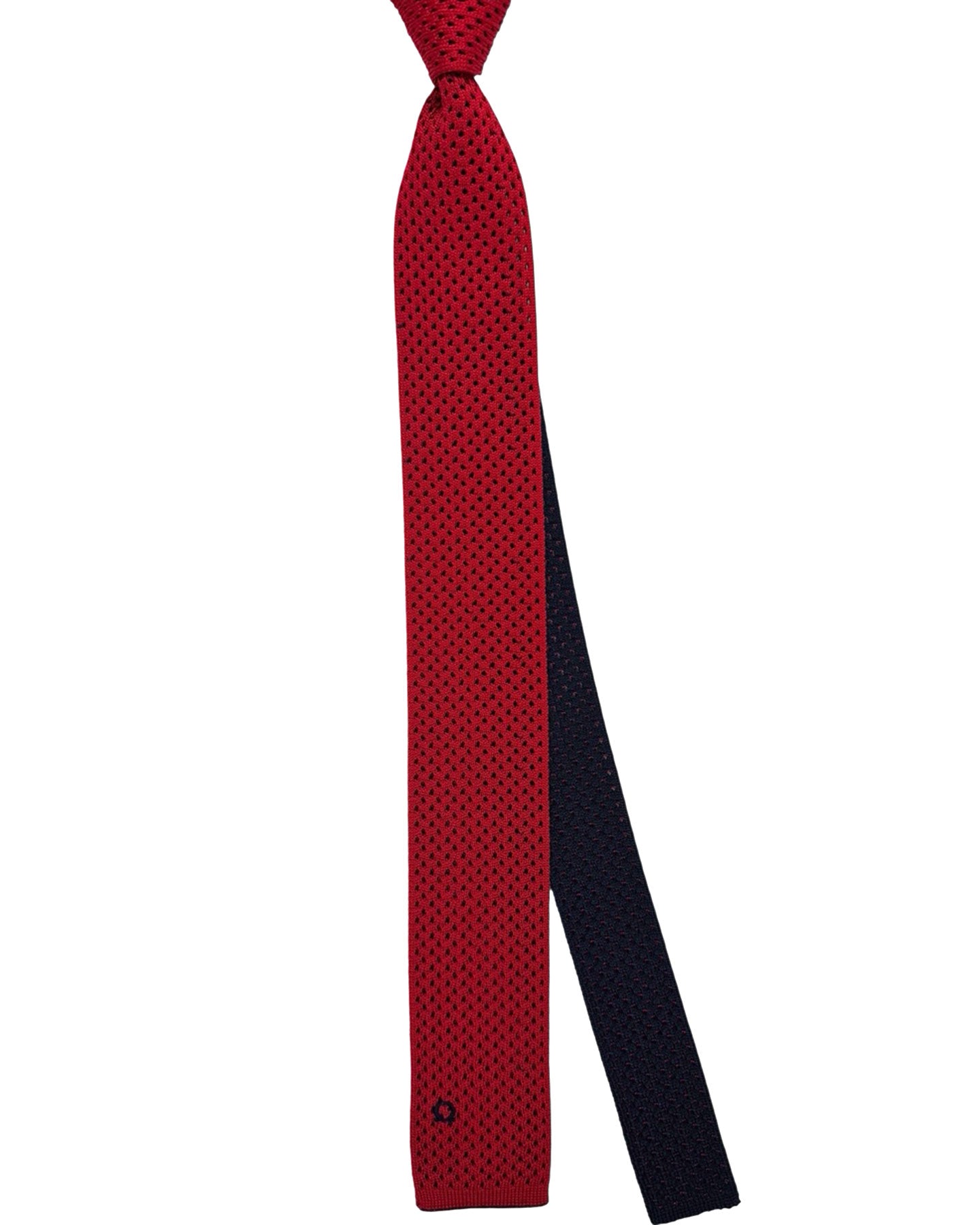 SALE - Genuine skinny Salvatore Ferragamo square end knitted tie, silk, dark navy with bordeaux reverse (2 sided), hand made in Italy. Original Salvatore Ferragamo ties online, men collection. Shop square end knitted ties.