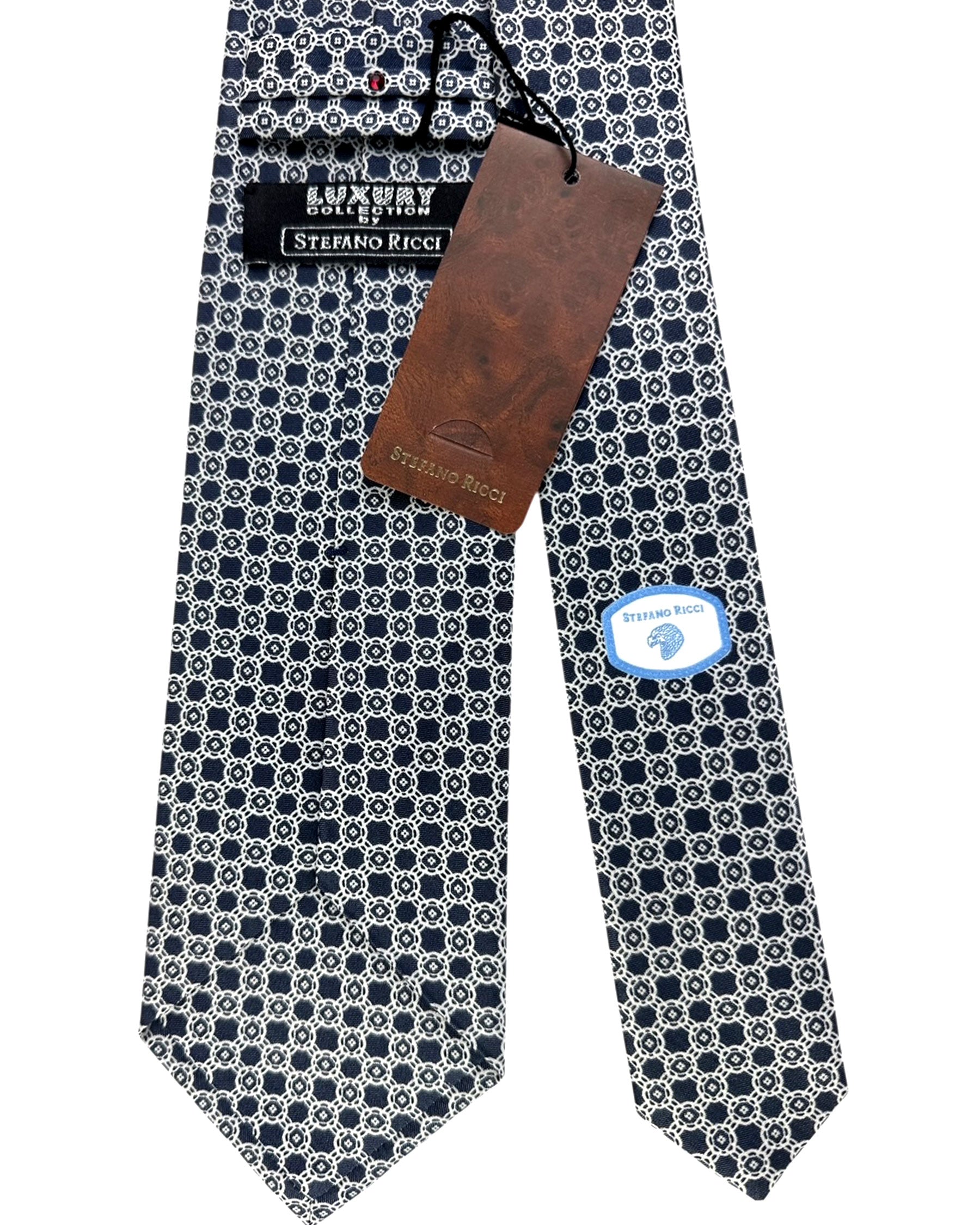 Authentic Stefano Ricci tie, midnight blue silver geometric design, printed silk, hand made in Italy. Genuine Stefano Ricci ties at outlet prices. Luxury men designer ties and accessories.