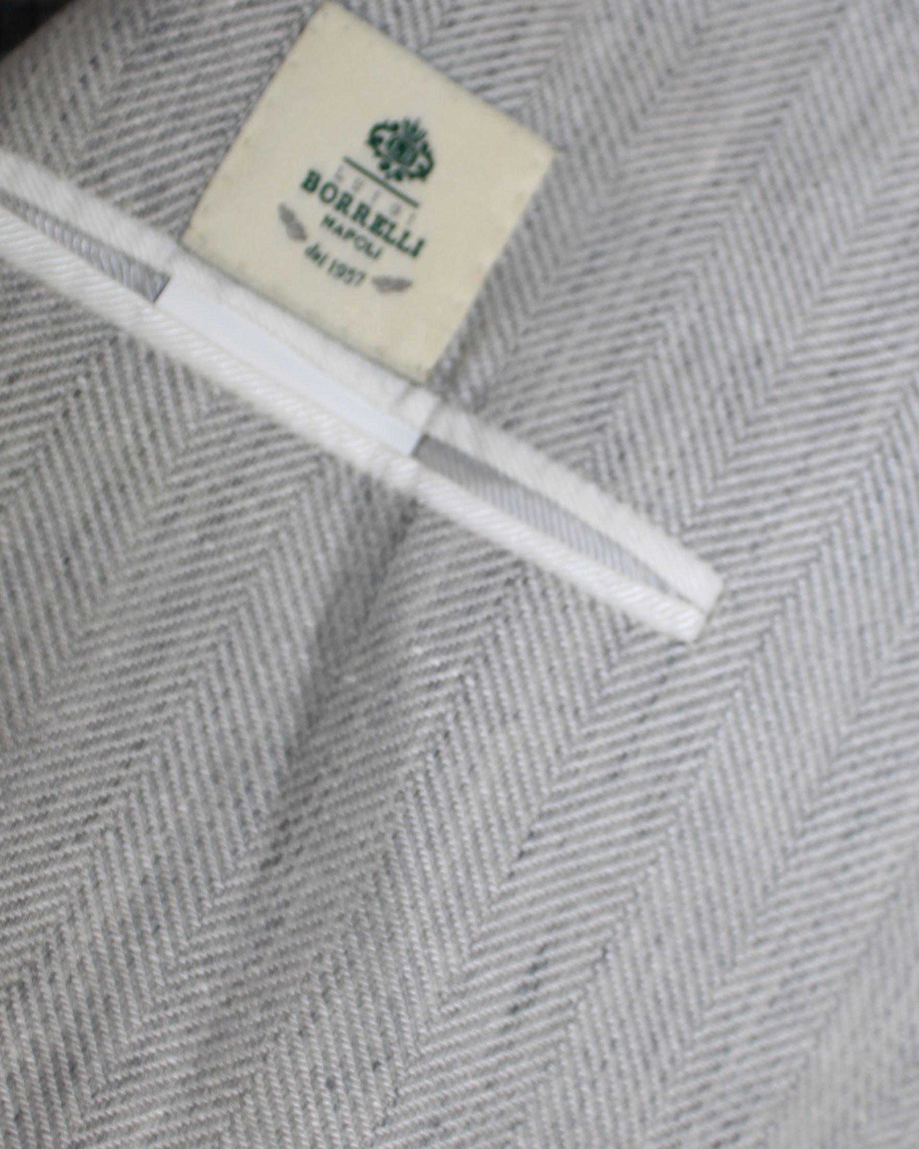 Genuine Luigi Borrelli sport coat, two button, peak lapel, gray tonal herringbone stripes, wool/ silk/ linen, unlined jacket/ blazer, soft shoulders, hand made in Italy. Sartorial quality men suits by Luigi Borrelli, hand made in Italy.