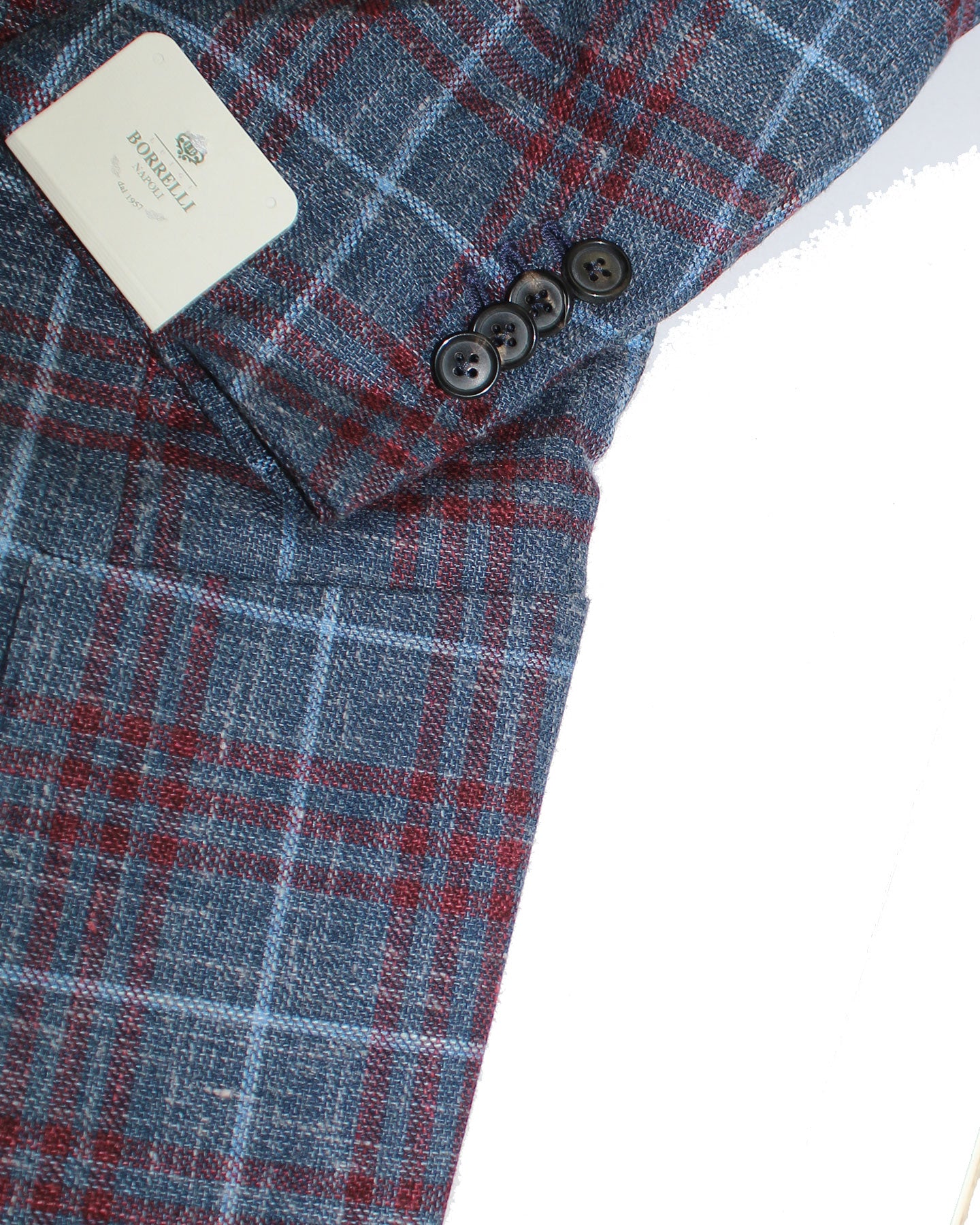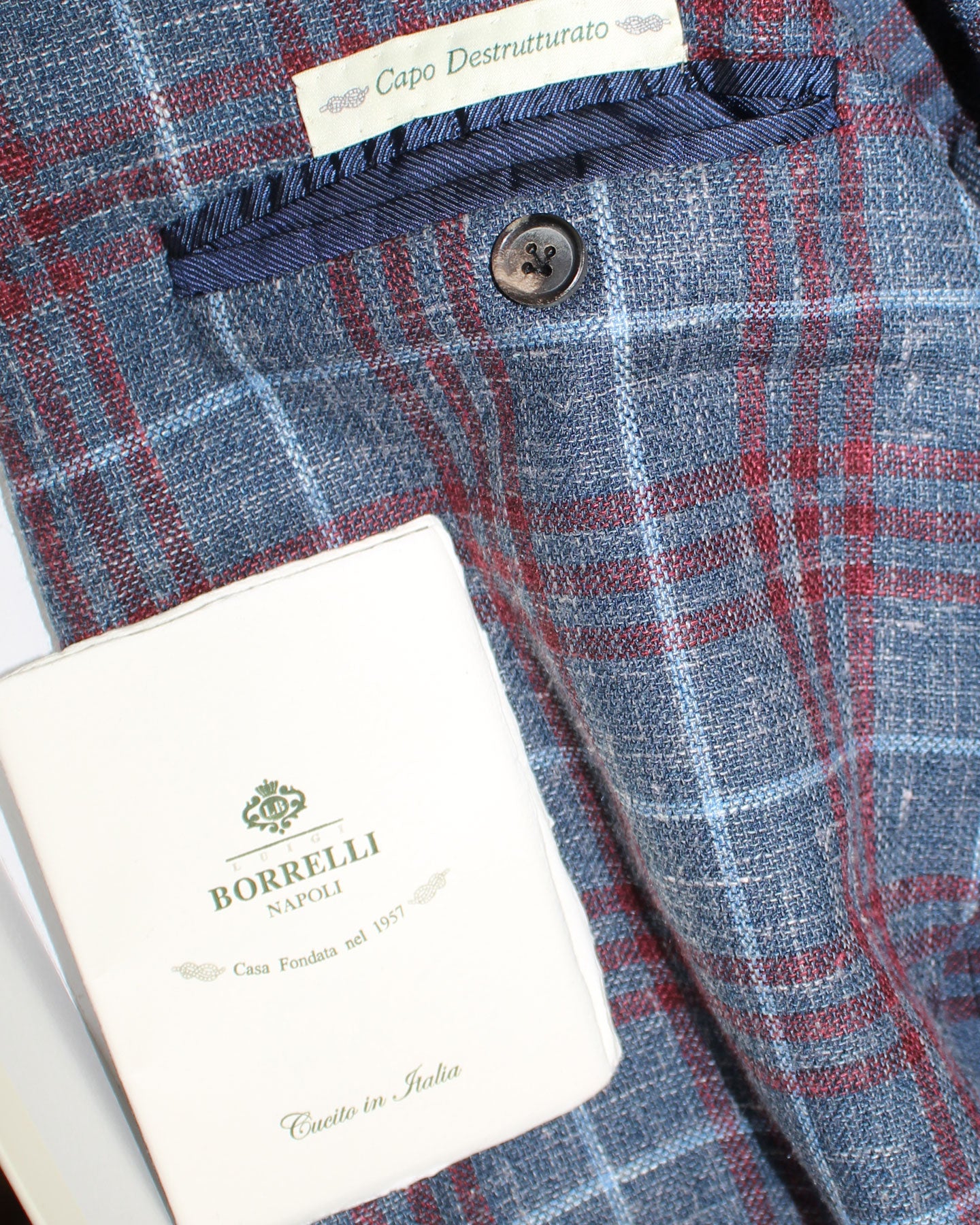 Genuine Luigi Borrelli sport coat, 'Capo Destrutturato', midnight blue with maroon plaid check design, wool/ silk/ linen, Royal Collection, unlined, soft shoulder, bucket pockets, notch lapel, sartorial, hand made in Italy. Sartorial quality men sport jackets, blazers and suits by Luigi Borrelli. Shop Sartorial Sport Coats.