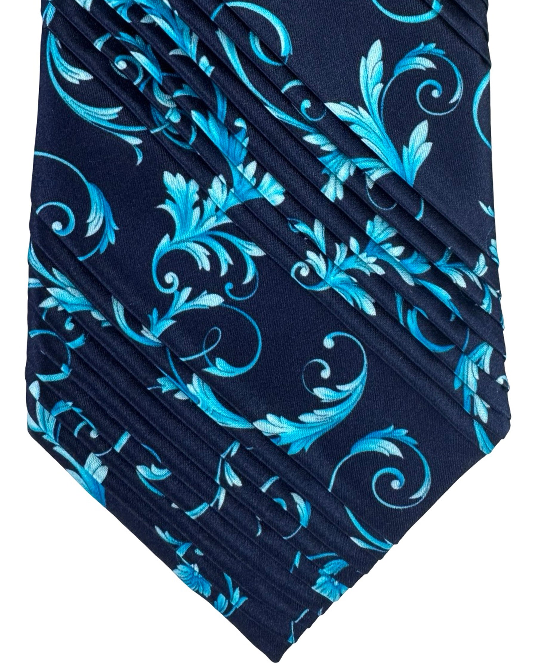 Luxury: Genuine Vitaliano tie, pleated silk, midnight blue aqua baroque design, pleated silk tie, hand made in Italy. The Vitaliano Pancaldi tie is hand made in very limited quantities, the tie features a golden chain logo hanger at the back loop. Shop all Vitaliano pleated ties at discount prices, luxury men designer gifts.