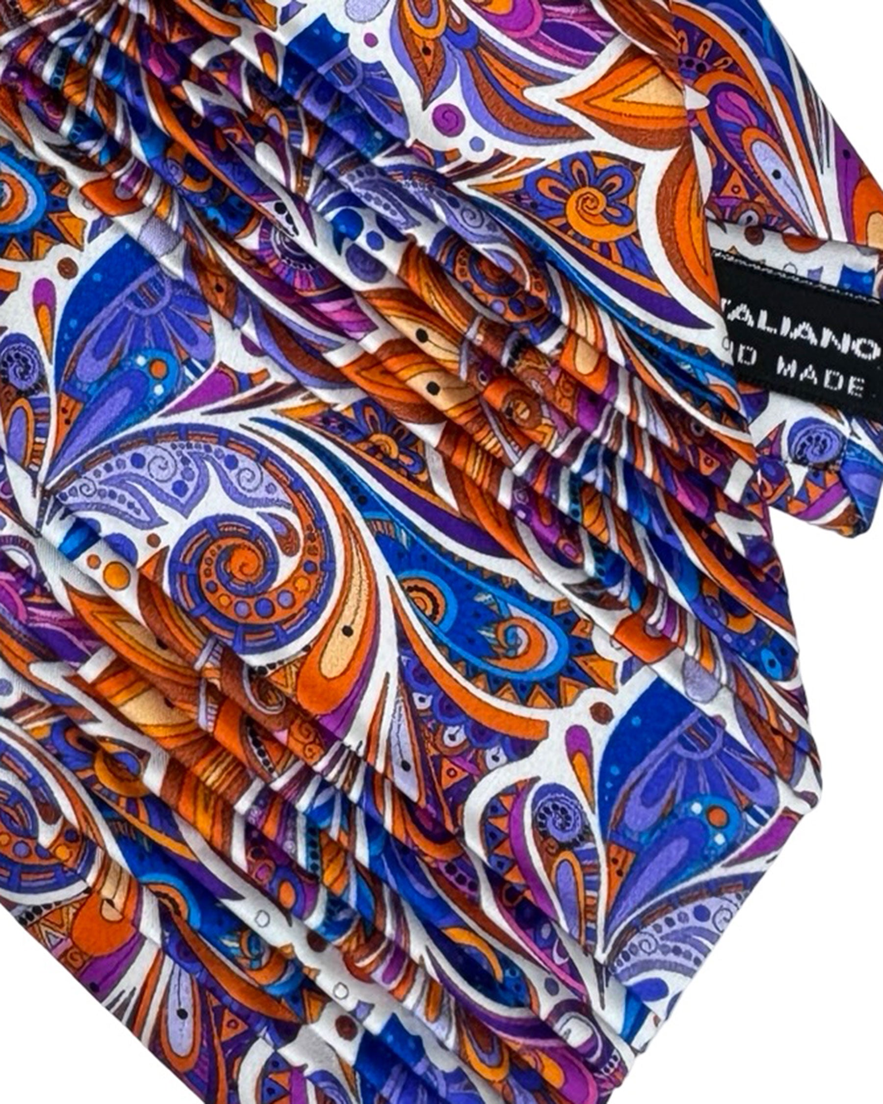 Luxury: Genuine Vitaliano tie, pleated silk, white royal blue orange design, pleated silk tie, hand made in Italy. The Vitaliano Pancaldi tie is made in very limited quantities, the tie features a golden chain logo hanger at the back loop. Shop all Vitaliano pleated ties at discount prices, luxury men designer gifts.