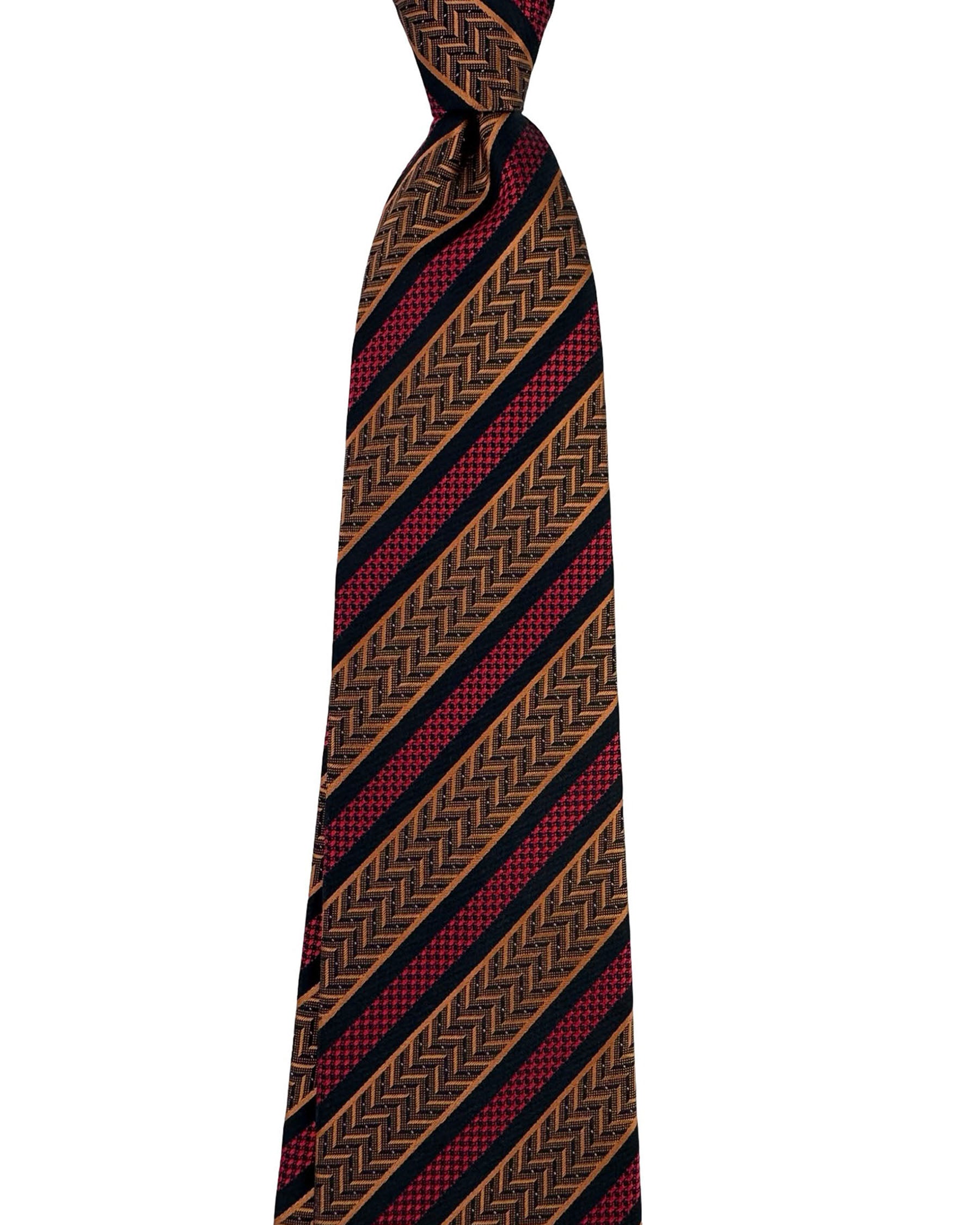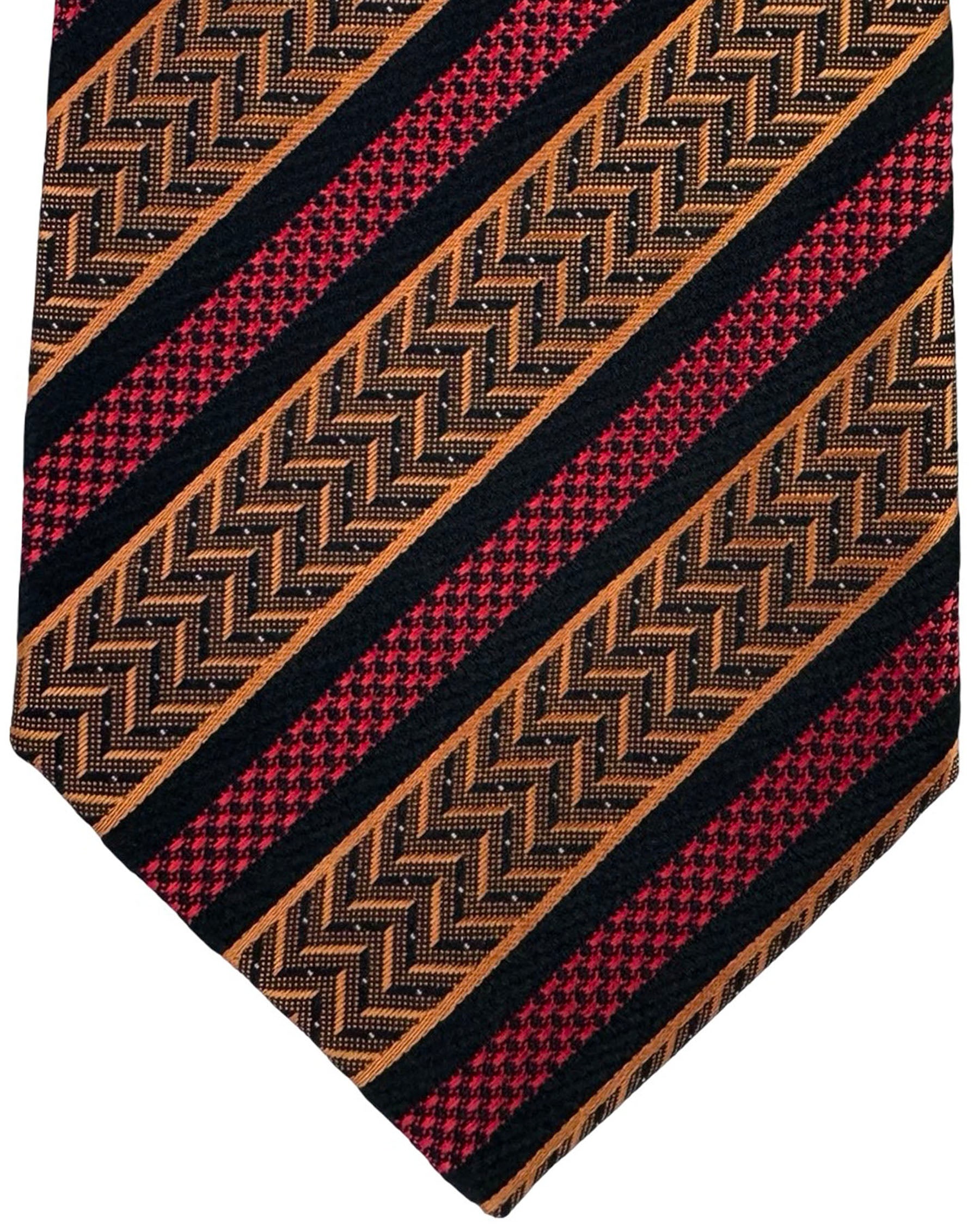 Authentic Missoni tie, black background with diagonal stripe bands featuring copper herringbone motifs and red micro patterns, jacquard silk, hand made in Italy. Genuine Missoni men collection designer neckties/ accessories at outlet prices online.