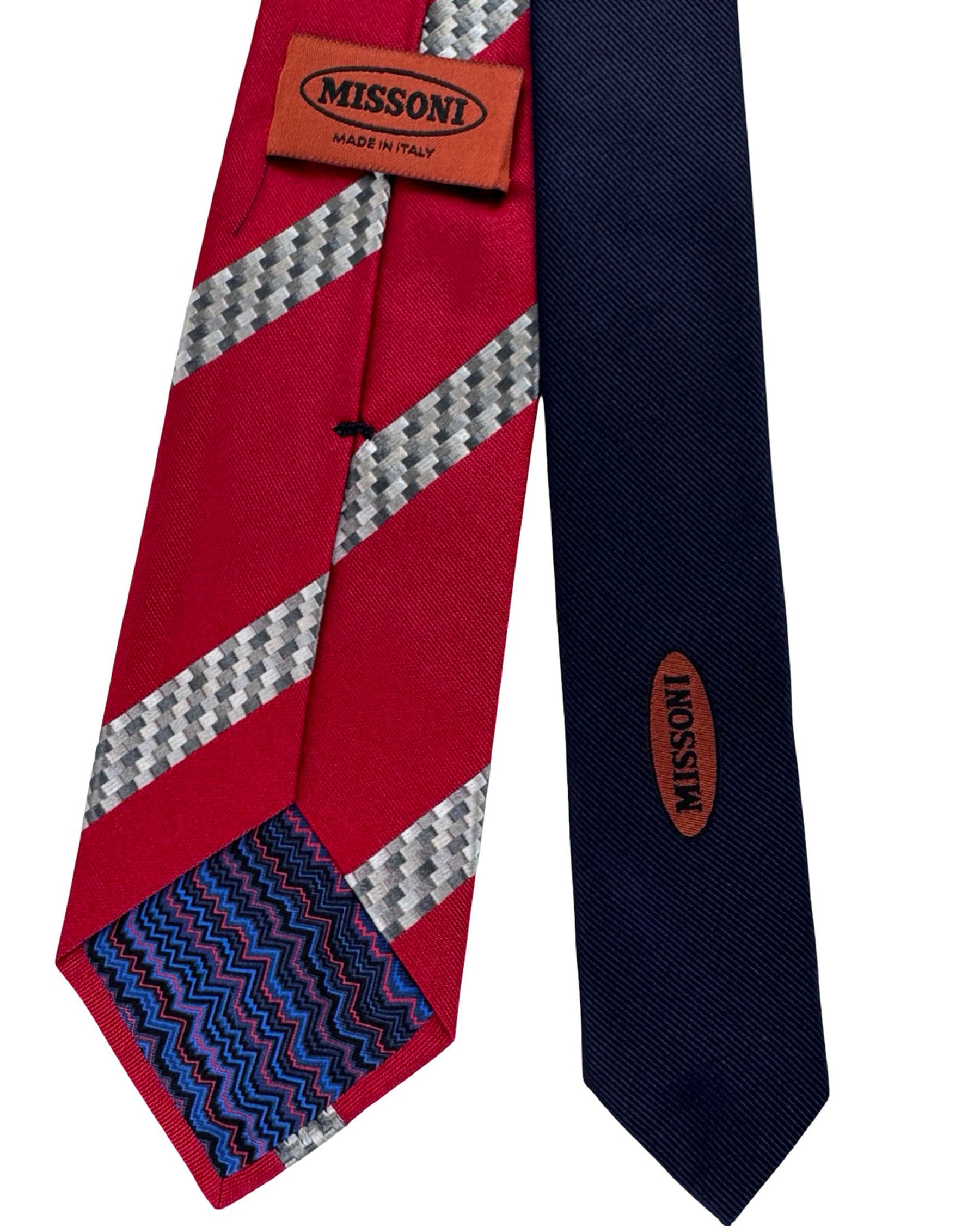 Authentic Missoni tie, red background accented by a wide diagonal stripe in layered grey geometric patterning, jacquard silk, hand made in Italy. Genuine Missoni men collection designer neckties/ accessories at outlet prices online.