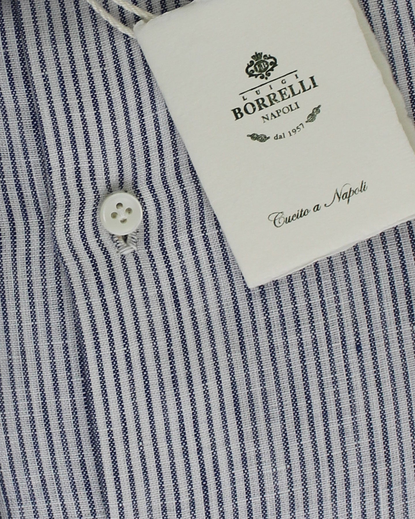 Summer Collection: Authentic Luigi Borrelli sport shirt, modern fit, white navy stripes, (soft) collar, linen, Luxury Vintage Archivio 1957 collection, hand made in Napoli, Italy. Shop the sartorial dress shirts and ties of the Luigi Borrelli men collection.