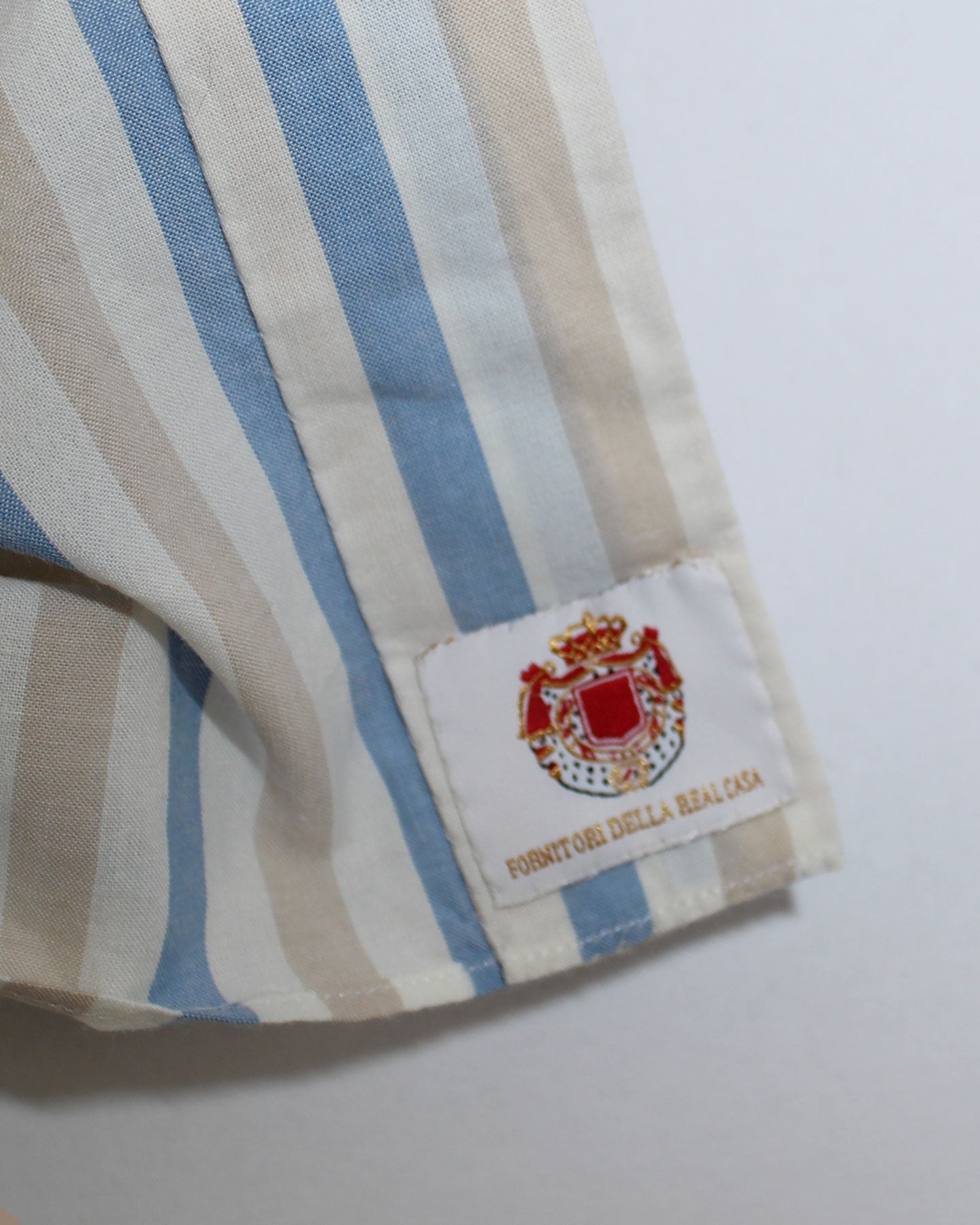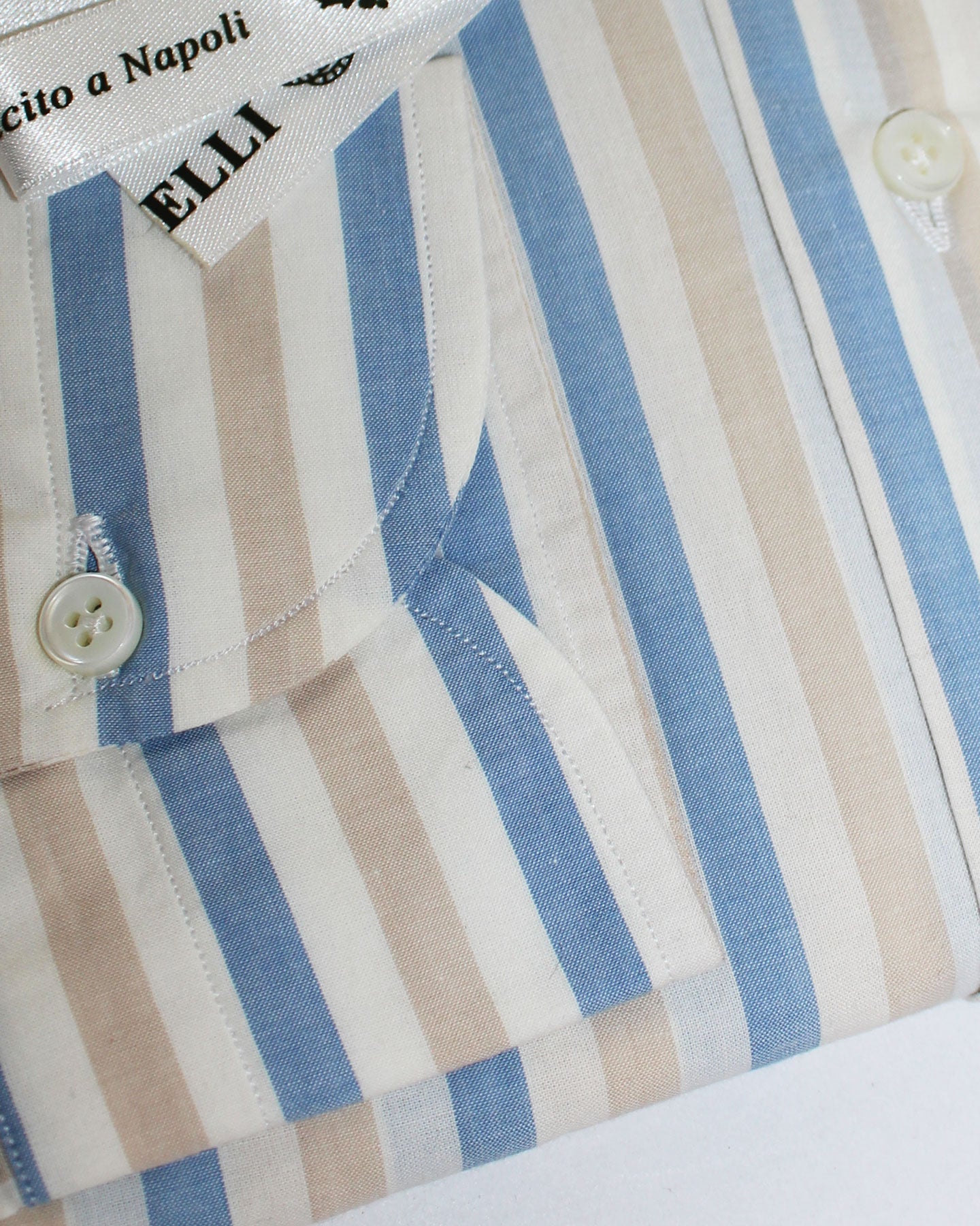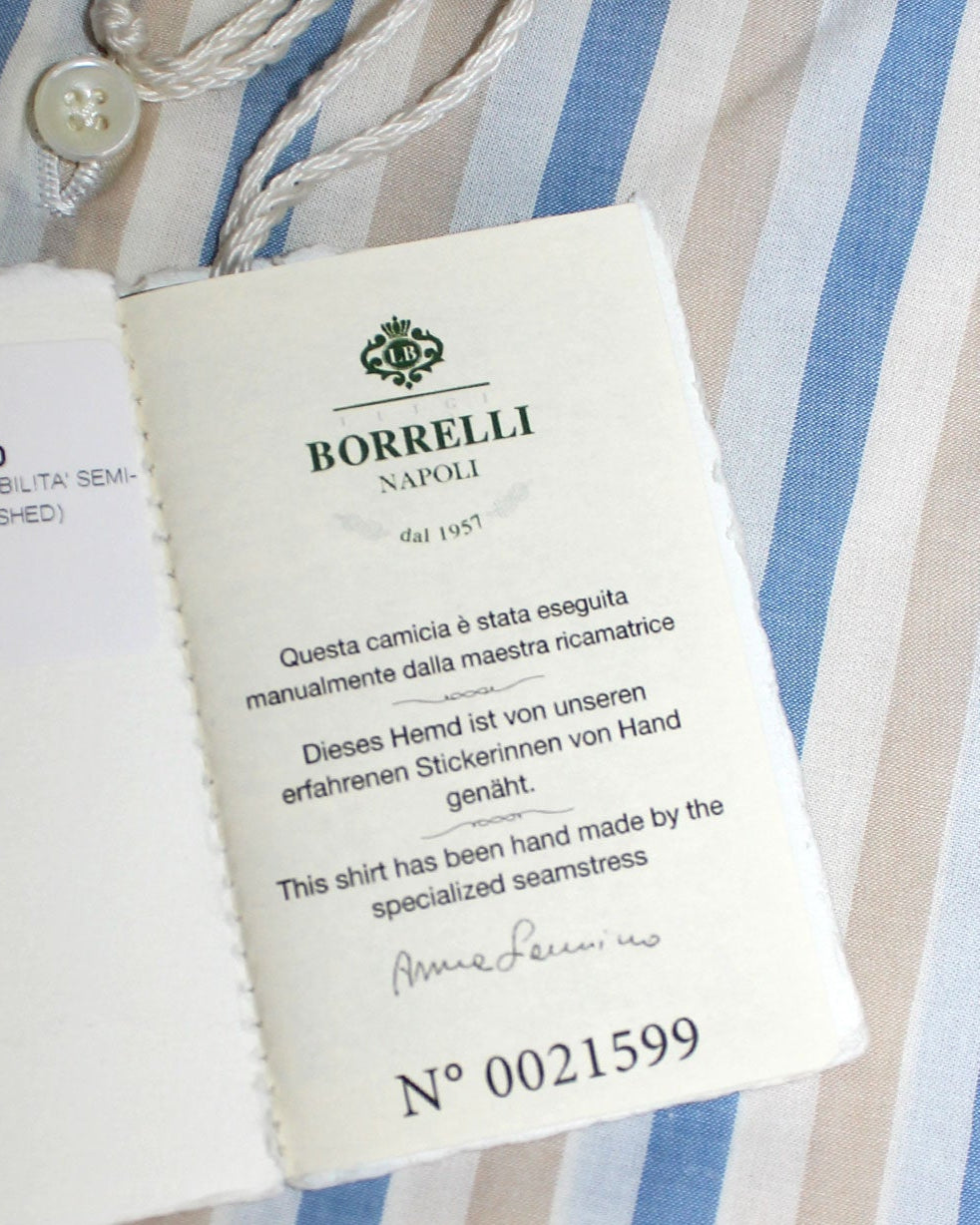 Summer Collection: Authentic Luigi Borrelli sport shirt, modern fit, white blue cream stripes pattern, moderate spread collar, cotton, 8 steps by hand, made in Napoli, Italy. Shop the sartorial dress shirts and ties of the Luigi Borrelli men collection.