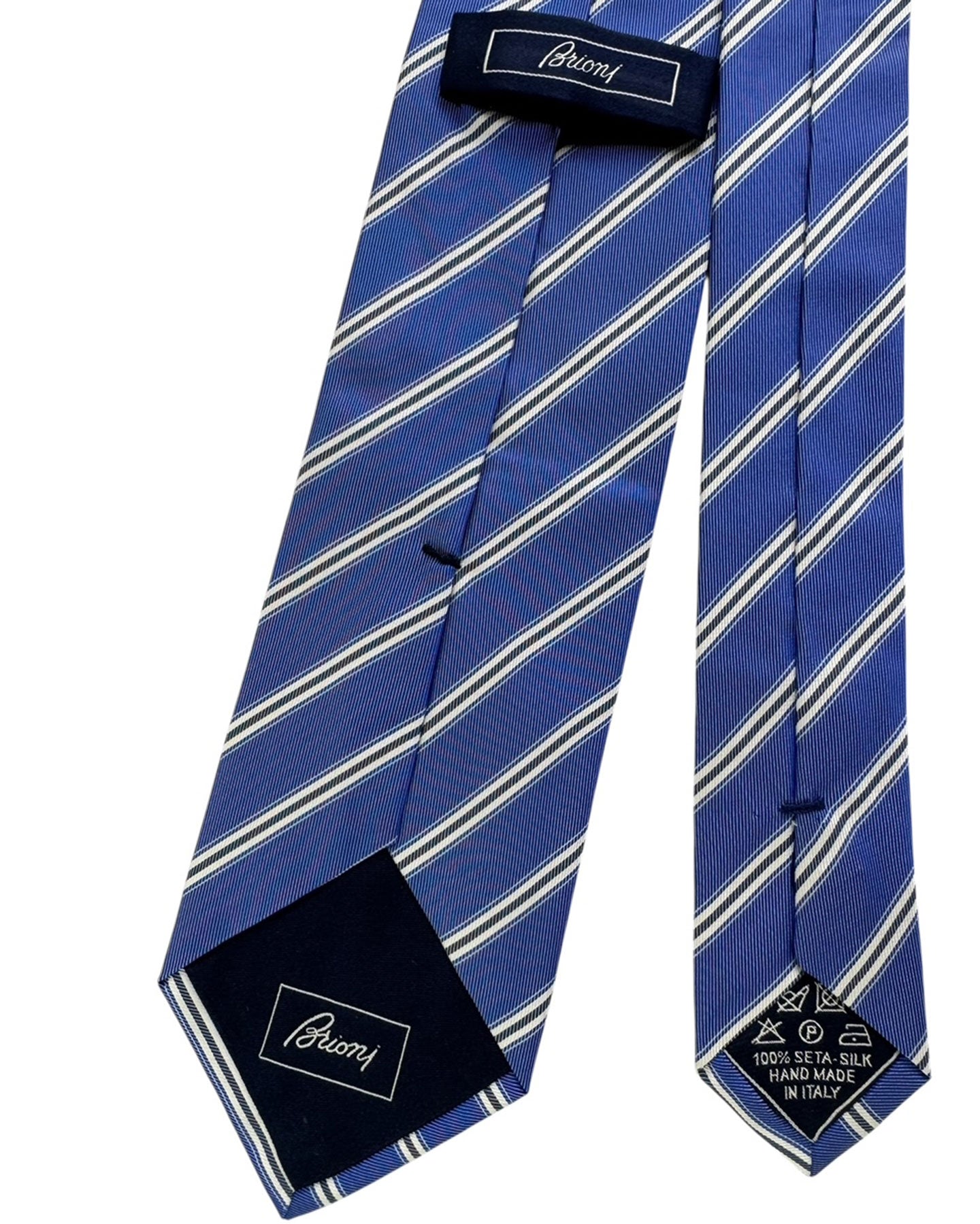 Genuine Brioni tie, royal blue white stripes design, silk, hand made in Italy. Discount Brioni ties, sartorial quality accessories for men, Brioni at outlet prices.