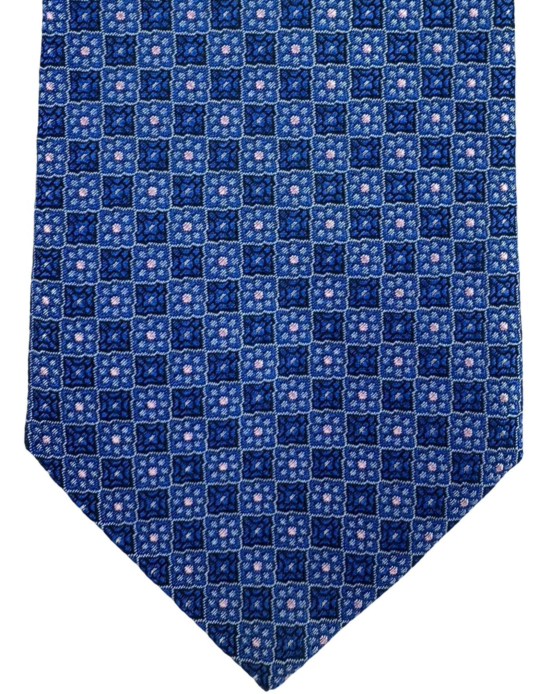 New Collection: Genuine Etro tie, grid of blue squares accented with small pink center dots, jacquard silk, hand made in Italy. Authentic Etro men collection, luxury fashion accessories, made in Italy. Discount men designer neckties.
