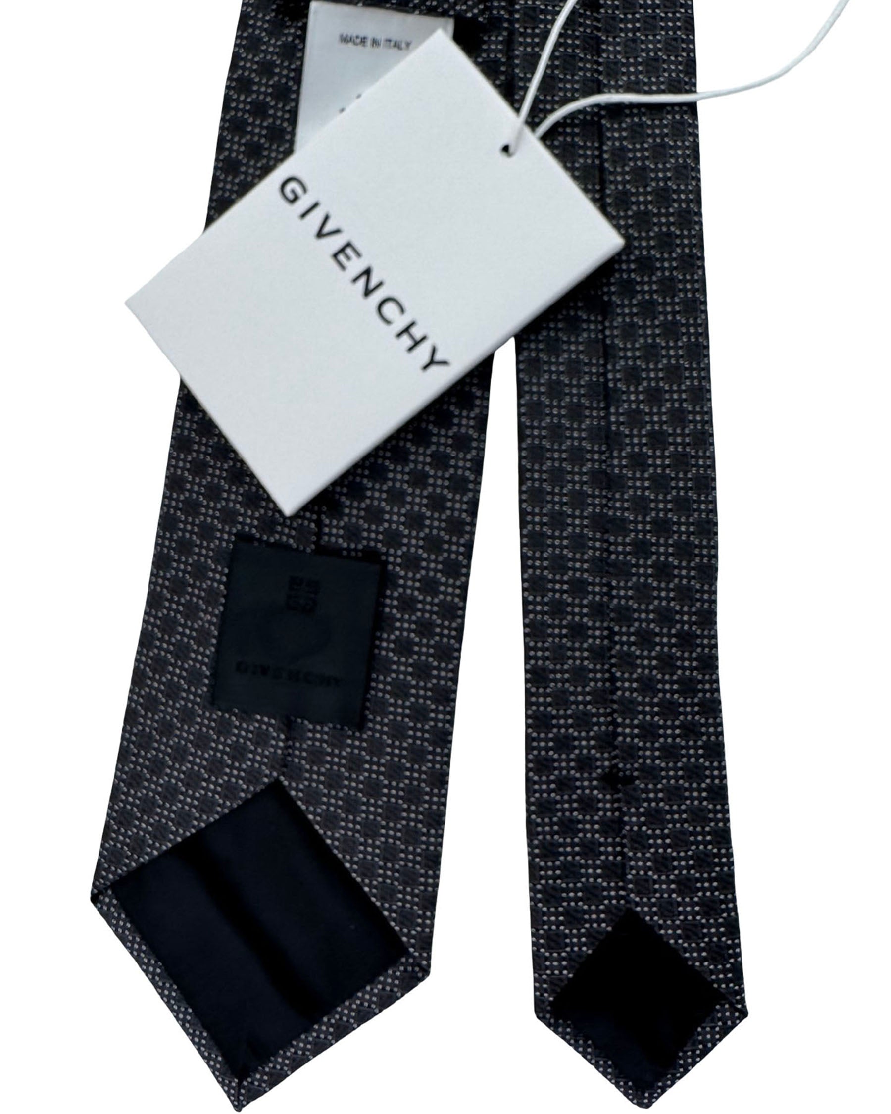 Authentic Givenchy tie, black background with a tight repeating grid of small woven squares and white micro-dot accents, jacquard silk, hand made in Italy. Genuine Givenchy men collection accessories at outlet prices.