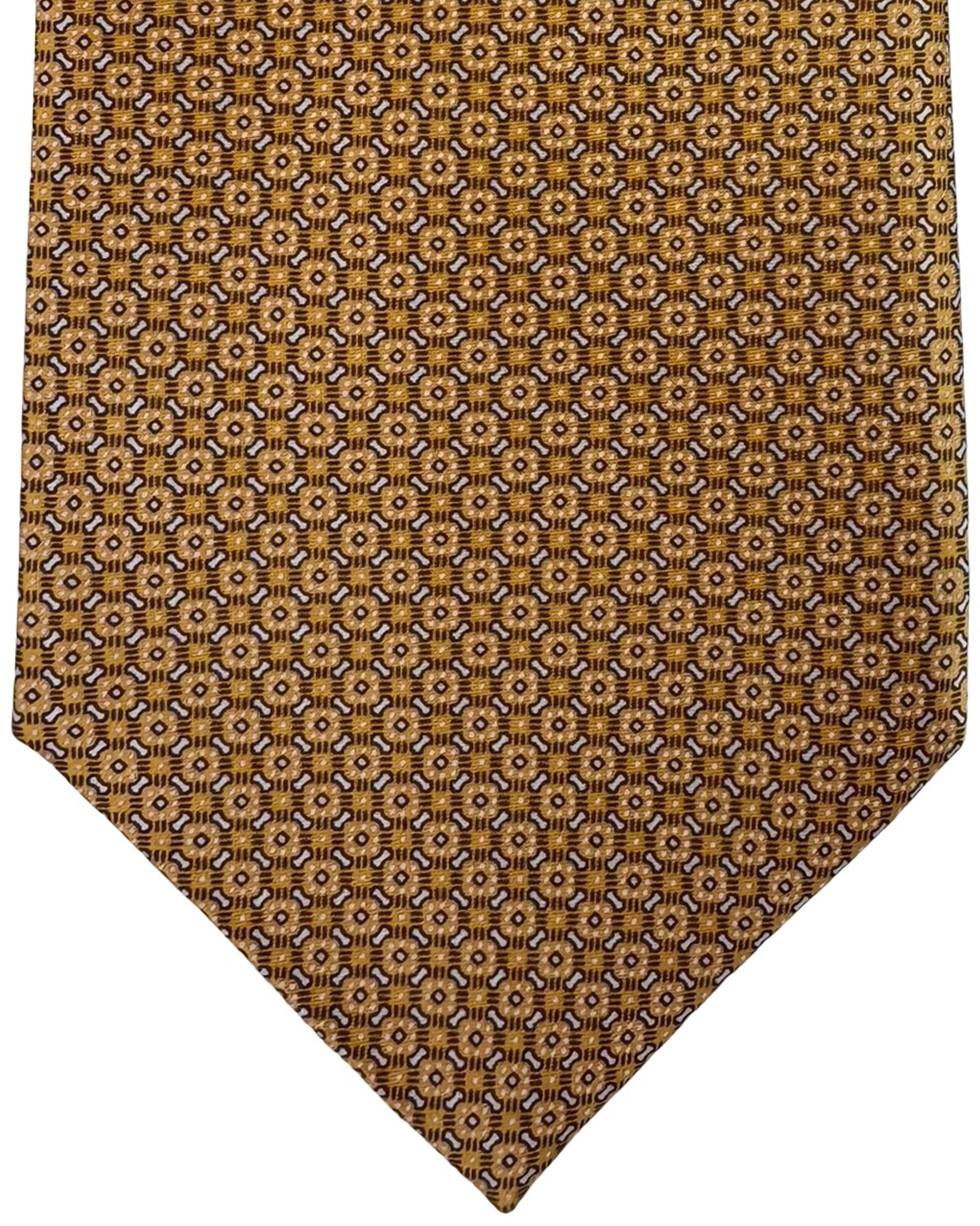 Authentic Stefano Ricci tie, orange and gold background filled with a dense repeating brown and cream geometric lattice, printed silk, hand made in Italy. Genuine Stefano Ricci ties at outlet prices. Luxury men designer ties and accessories.