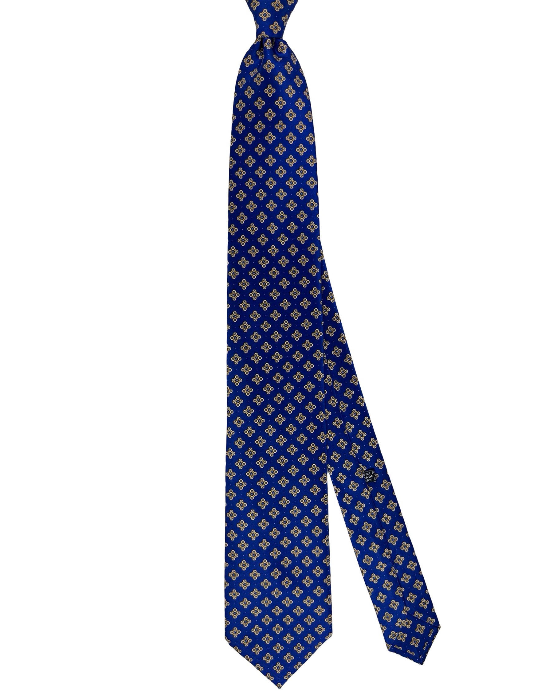 Authentic Stefano Ricci tie, royal blue background featuring small repeating gold and light-blue medallions, printed silk, hand made in Italy. Genuine Stefano Ricci ties at outlet prices. Luxury men designer ties and accessories.