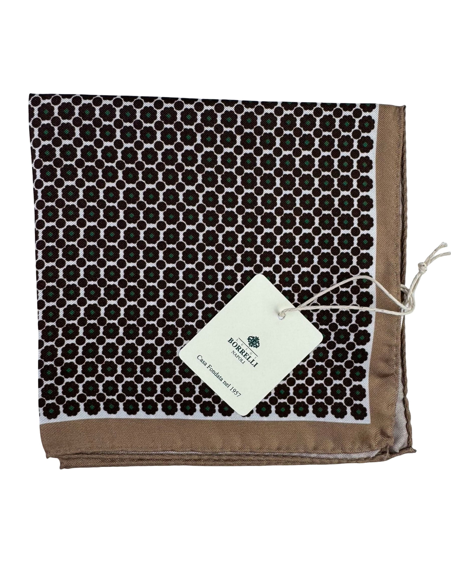 Authentic Luigi Borrelli pocket square, brown green taupe geometric design, silk, hand made in Italy. Genuine Luigi Borrelli men's collection. Designer pocket squares/ hankies for men.