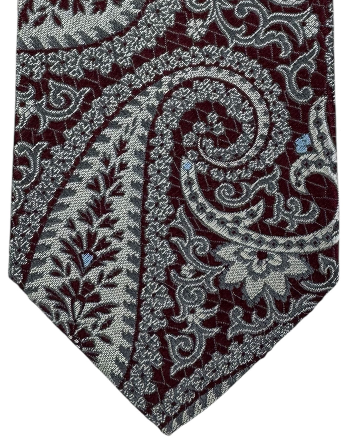 Genuine Calibre skinny tie, dark maroon paisley with silver and grey, jacquard silk, hand made in Italy.
