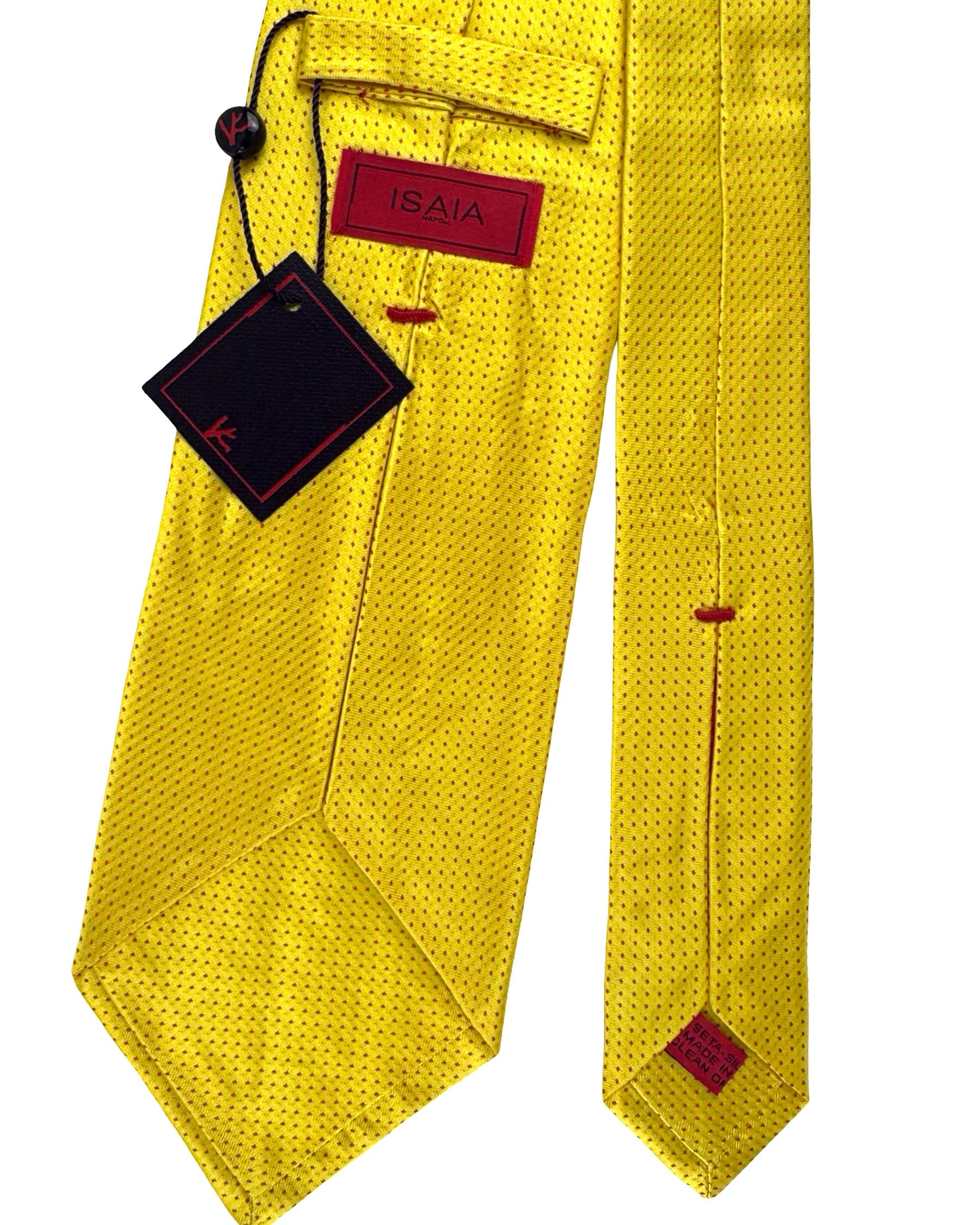 sale - Genuine Isaia tie, Yellow / Blue Polka Dots design, linen, hand made in Italy. Isaia Napoli men clothes, hand made in Italy, sartorial quality. Isaia men collection at outlet prices.