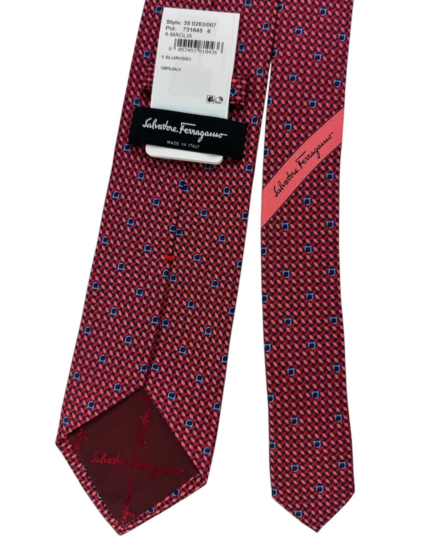 Authentic Salvatore Ferragamo tie, red pink blue Maglia Gancini design, silk, hand made in Italy. Genuine discount Ferragamo ties online, Ferragamo men collection at outlet prices. The most popular high-end novelty tie in the world.