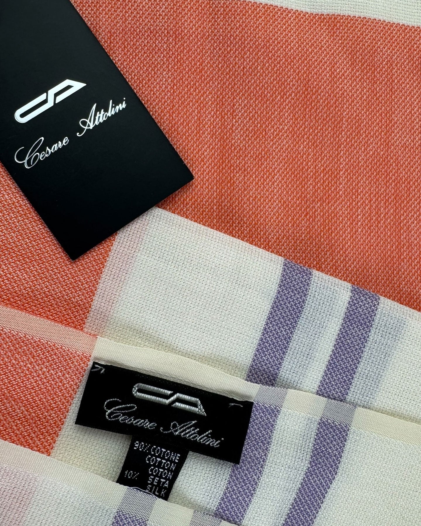 Summer collection: Genuine Attolini scarf, white peach-pink and lilac stipres design, eyelash short fringe, lightweight cotton, made in Italy. Cesare Attolini: sartorial quality designer shawls and scarves at outlet prices.