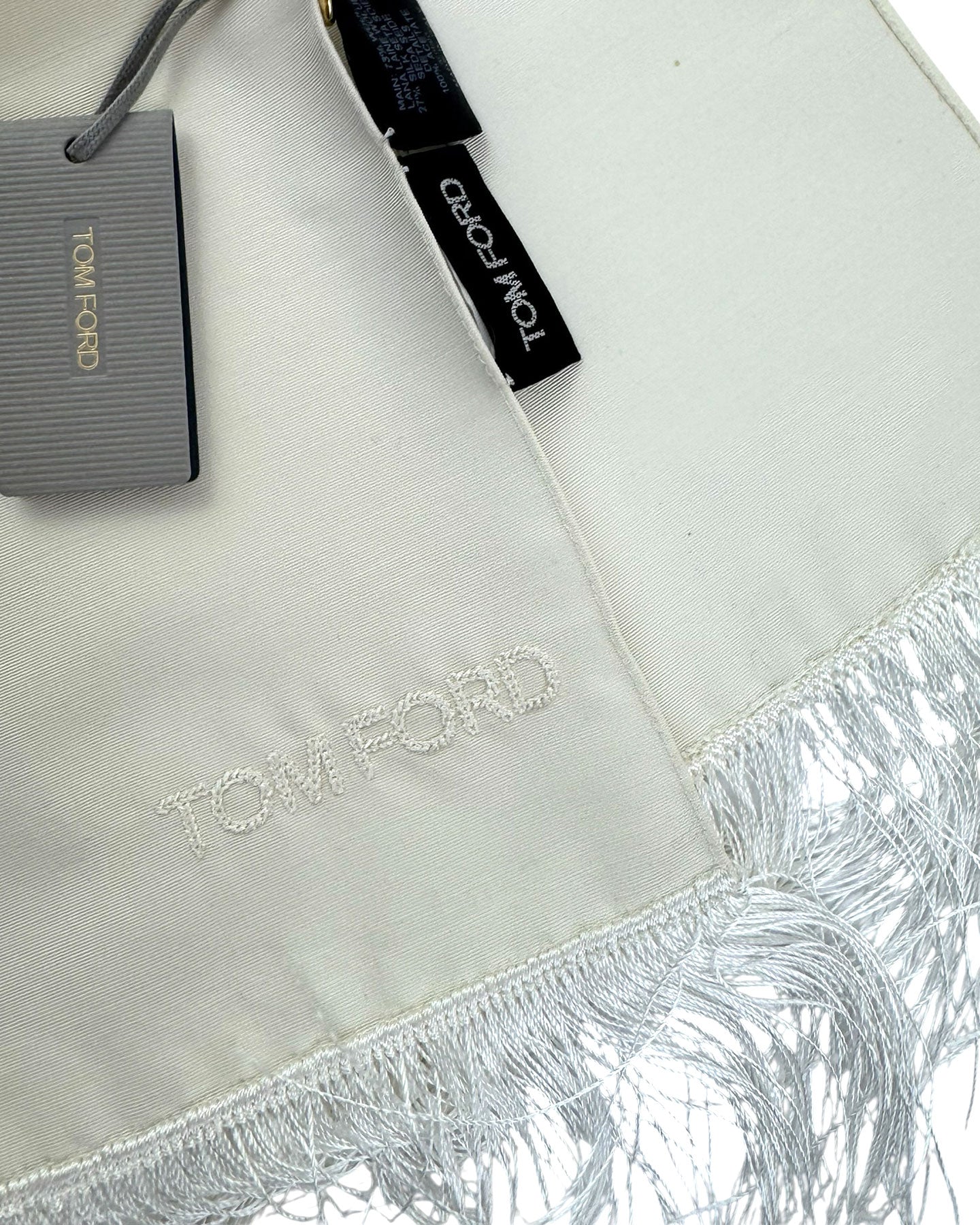 Men collection: Genuine Tom Ford scarf, solid ivory white, embroidered TOM FORD logo, wool/ silk, long fringe, made in Italy. Genuine Tom Ford men accessories at outlet prices.