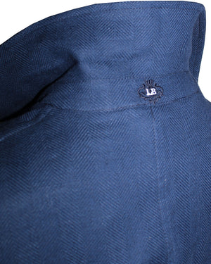 Genuine Luigi Borrelli coat, button front, navy, wool/ linen, unlined, bucket pockets, button cuffs, sartorial, LB logo behind back of collar, hand made in Italy. Sartorial quality men sport jackets and suits by Luigi Borrelli. Shop Bespoke Sport Coats.