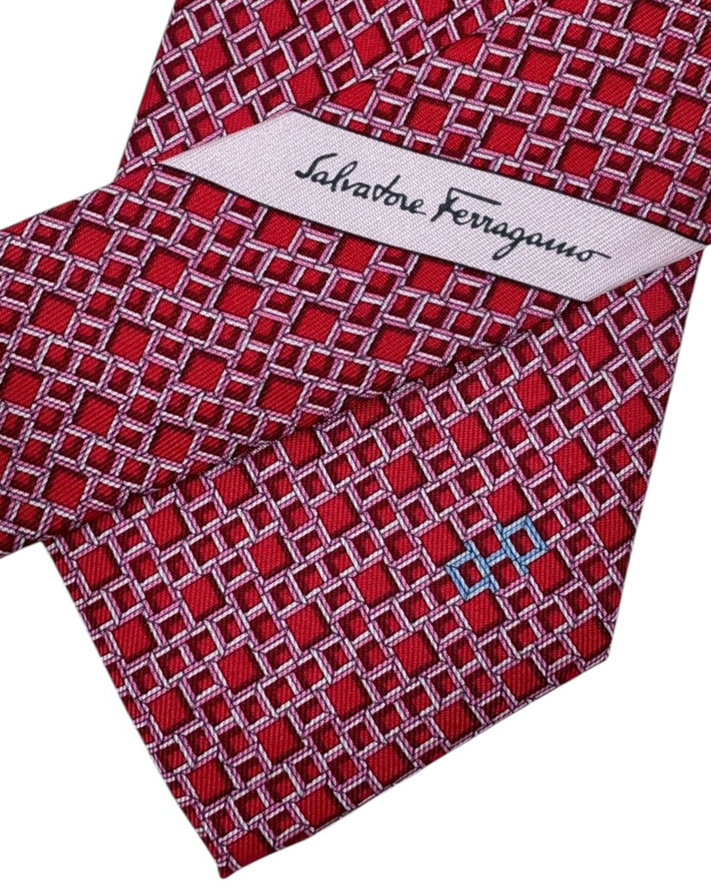 Authentic Salvatore Ferragamo tie, red pink square Gancini / horsebit design, silk, hand made in Italy. Genuine discount Salvatore Ferragamo ties online, men collection at outlet prices. The most popular high-end novelty tie in the world.