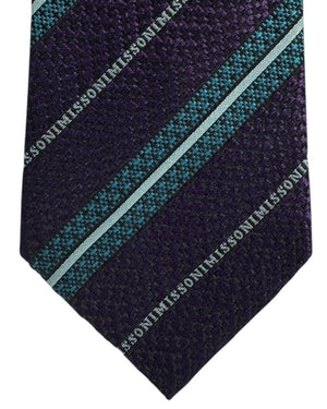 Authentic Missoni tie, logo stripes pattern in shades of deep purple and teal blue, with subtle houndstooth texture, jacquard silk, hand made in Italy. Genuine Missoni men collection neckties/ accessories at outlet prices online.