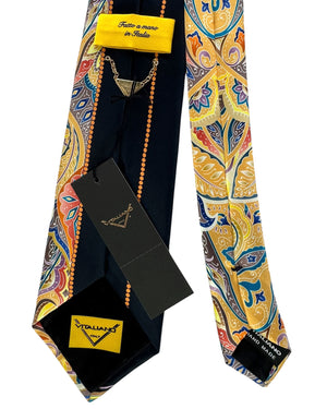 Authentic Vitaliano Pancaldi tie, black orange ornamental swirl design, fancy printed silk, hand made in Italy. Genuine Vitaliano Pancaldi ties are luxury Italian designer neckties. Shop all Vitaliano ties.